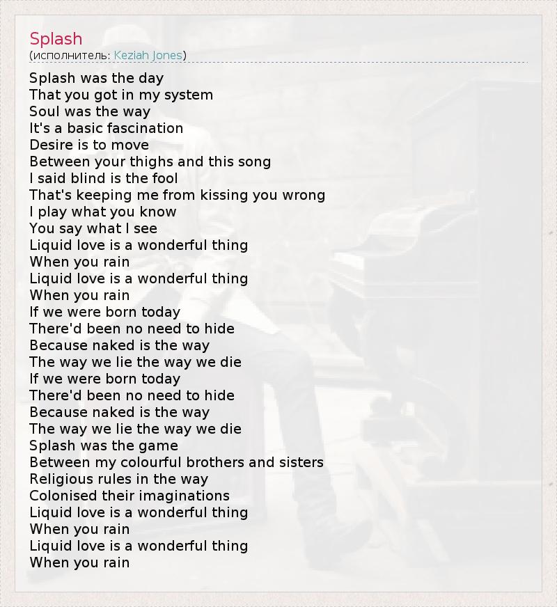 Splash was the day That you got in my system Soul was the way It's a basic fascination Desire is to move Between your thighs and this song I said blind is the fool That's keeping me from kissing you wrong I play what you know You say what I see Liquid love is a wonderful thing When you rain Liquid love is a wonderful thing When you rain If we were born today There'd been no need to hide Because naked is the way The way we lie the way we die If we were born today There'd been no need to hide Because naked is the way The way we lie the way we die Splash was the game Between my colourful brothers and sisters Religious rules in the way Colonised their imaginations Liquid love is a wonderful thing When you rain Liquid love is a wonderful thing When you rain