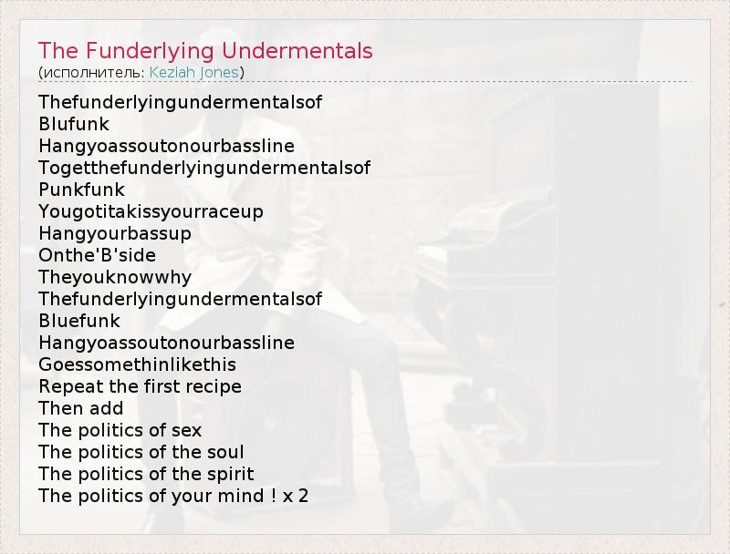 Thefunderlyingundermentalsof Blufunk Hangyoassoutonourbassline Togetthefunderlyingundermentalsof Punkfunk Yougotitakissyourraceup Hangyourbassup Onthe'B'side Theyouknowwhy Thefunderlyingundermentalsof Bluefunk Hangyoassoutonourbassline Goessomethinlikethis Repeat the first recipe Then add The politics of sex The politics of the soul The politics of the spirit The politics of your mind ! x 2