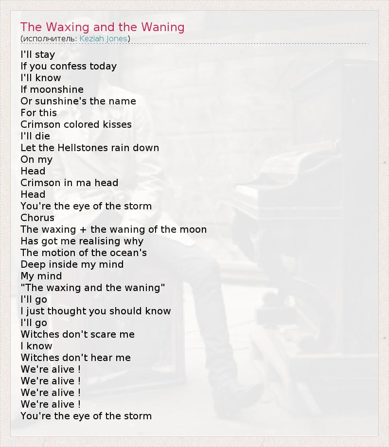 I'll stay If you confess today I'll know If moonshine Or sunshine's the name For this Crimson colored kisses I'll die Let the Hellstones rain down On my Head Crimson in ma head Head You're the eye of the storm Chorus The waxing + the waning of the moon Has got me realising why The motion of the ocean's Deep inside my mind My mind "The waxing and the waning" I'll go I just thought you should know I'll go Witches don't scare me I know Witches don't hear me We're alive ! We're alive ! We're alive ! We're alive ! You're the eye of the storm