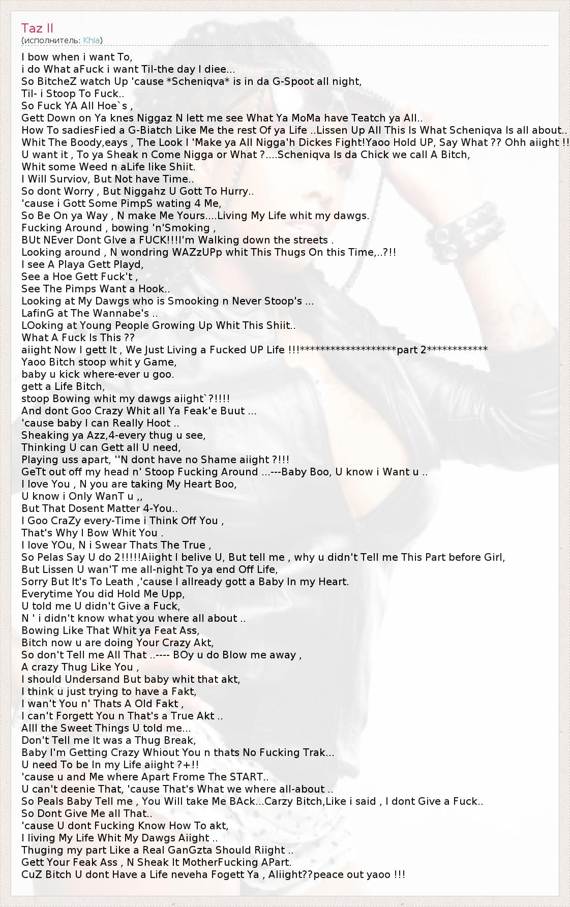 I bow when i want To, i do What aFuck i want Til-the day I diee... So BitcheZ watch Up 'cause *Scheniqva* is in da G-Spoot all night, Til- i Stoop To Fuck.. So Fuck YA All Hoe`s , Gett Down on Ya knes Niggaz N lett me see What Ya MoMa have Teatch ya All.. How To sadiesFied a G-Biatch Like Me the rest Of ya Life ..Lissen Up All This Is What Scheniqva Is all about.. Whit The Boody,eays , The Look I 'Make ya All Nigga'h Dickes Fight!Yaoo Hold UP, Say What ?? Ohh aiight !! U want it , To ya Sheak n Come Nigga or What ?....Scheniqva Is da Chick we call A Bitch, Whit some Weed n aLife like Shiit. I Will Surviov, But Not have Time.. So dont Worry , But Niggahz U Gott To Hurry.. 'cause i Gott Some PimpS wating 4 Me, So Be On ya Way , N make Me Yours....Living My Life whit my dawgs. Fucking Around , bowing 'n'Smoking , BUt NEver Dont GIve a FUCK!!!I'm Walking down the streets . Looking around , N wondring WAZzUPp whit This Thugs On this Time,..?!! I see A Playa Gett Playd, See a Hoe Gett Fuck't , See The Pimps Want a Hook.. Looking at My Dawgs who is Smooking n Never Stoop's ... LafinG at The Wannabe's .. LOoking at Young People Growing Up Whit This Shiit.. What A Fuck Is This ?? aiight Now I gett It , We Just Living a Fucked UP Life !!!*******************part 2************ Yaoo Bitch stoop whit y Game, baby u kick where-ever u goo. gett a Life Bitch, stoop Bowing whit my dawgs aiight`?!!!! And dont Goo Crazy Whit all Ya Feak'e Buut ... 'cause baby I can Really Hoot .. Sheaking ya Azz,4-every thug u see, Thinking U can Gett all U need, Playing uss apart, ''N dont have no Shame aiight ?!!! GeTt out off my head n' Stoop Fucking Around ...---Baby Boo, U know i Want u .. I love You , N you are taking My Heart Boo, U know i Only WanT u ,, But That Dosent Matter 4-You.. I Goo CraZy every-Time i Think Off You , That's Why I Bow Whit You . I love YOu, N i Swear Thats The True , So Pelas Say U do 2!!!!!Aiight I belive U, But tell me , why u didn't Tell me This Part before Girl, But Lissen U wan'T me all-night To ya end Off Life, Sorry But It's To Leath ,'cause I allready gott a Baby In my Heart. Everytime You did Hold Me Upp, U told me U didn't Give a Fuck, N ' i didn't know what you where all about .. Bowing Like That Whit ya Feat Ass, Bitch now u are doing Your Crazy Akt, So don't Tell me All That ..---- BOy u do Blow me away , A crazy Thug Like You , I should Undersand But baby whit that akt, I think u just trying to have a Fakt, I wan't You n' Thats A Old Fakt , I can't Forgett You n That's a True Akt .. Alll the Sweet Things U told me... Don't Tell me It was a Thug Break, Baby I'm Getting Crazy Whiout You n thats No Fucking Trak... U need To be In my Life aiight ?+!! 'cause u and Me where Apart Frome The START.. U can't deenie That, 'cause That's What we where all-about .. So Peals Baby Tell me , You Will take Me BAck...Carzy Bitch,Like i said , I dont Give a Fuck.. So Dont Give Me all That.. 'cause U dont Fucking Know How To akt, I living My Life Whit My Dawgs Aiight .. Thuging my part Like a Real GanGzta Should Riight .. Gett Your Feak Ass , N Sheak It MotherFucking APart. CuZ Bitch U dont Have a Life neveha Fogett Ya , AIiight??peace out yaoo !!!