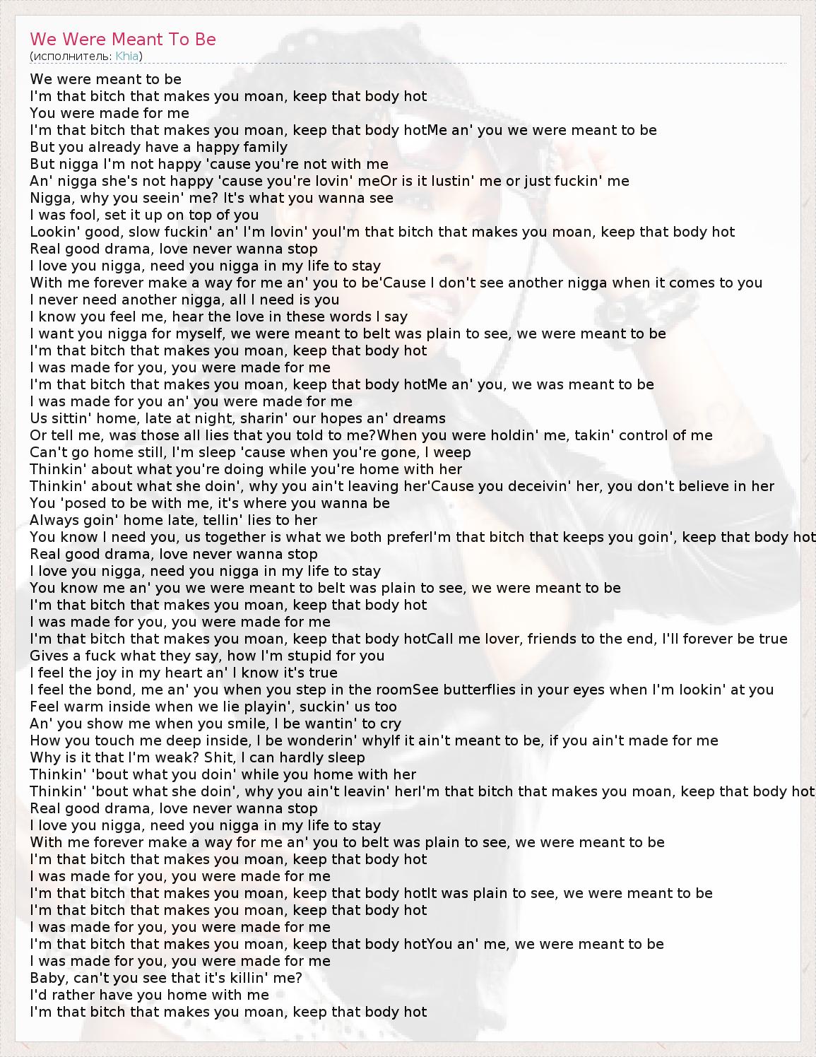 We were meant to be I'm that bitch that makes you moan, keep that body hot You were made for me I'm that bitch that makes you moan, keep that body hotMe an' you we were meant to be But you already have a happy family But nigga I'm not happy 'cause you're not with me An' nigga she's not happy 'cause you're lovin' meOr is it lustin' me or just fuckin' me Nigga, why you seein' me? It's what you wanna see I was fool, set it up on top of you Lookin' good, slow fuckin' an' I'm lovin' youI'm that bitch that makes you moan, keep that body hot Real good drama, love never wanna stop I love you nigga, need you nigga in my life to stay With me forever make a way for me an' you to be'Cause I don't see another nigga when it comes to you I never need another nigga, all I need is you I know you feel me, hear the love in these words I say I want you nigga for myself, we were meant to beIt was plain to see, we were meant to be I'm that bitch that makes you moan, keep that body hot I was made for you, you were made for me I'm that bitch that makes you moan, keep that body hotMe an' you, we was meant to be I was made for you an' you were made for me Us sittin' home, late at night, sharin' our hopes an' dreams Or tell me, was those all lies that you told to me?When you were holdin' me, takin' control of me Can't go home still, I'm sleep 'cause when you're gone, I weep Thinkin' about what you're doing while you're home with her Thinkin' about what she doin', why you ain't leaving her'Cause you deceivin' her, you don't believe in her You 'posed to be with me, it's where you wanna be Always goin' home late, tellin' lies to her You know I need you, us together is what we both preferI'm that bitch that keeps you goin', keep that body hot Real good drama, love never wanna stop I love you nigga, need you nigga in my life to stay You know me an' you we were meant to beIt was plain to see, we were meant to be I'm that bitch that makes you moan, keep that body hot I was made for you, you were made for me I'm that bitch that makes you moan, keep that body hotCall me lover, friends to the end, I'll forever be true Gives a fuck what they say, how I'm stupid for you I feel the joy in my heart an' I know it's true I feel the bond, me an' you when you step in the roomSee butterflies in your eyes when I'm lookin' at you Feel warm inside when we lie playin', suckin' us too An' you show me when you smile, I be wantin' to cry How you touch me deep inside, I be wonderin' whyIf it ain't meant to be, if you ain't made for me Why is it that I'm weak? Shit, I can hardly sleep Thinkin' 'bout what you doin' while you home with her Thinkin' 'bout what she doin', why you ain't leavin' herI'm that bitch that makes you moan, keep that body hot Real good drama, love never wanna stop I love you nigga, need you nigga in my life to stay With me forever make a way for me an' you to beIt was plain to see, we were meant to be I'm that bitch that makes you moan, keep that body hot I was made for you, you were made for me I'm that bitch that makes you moan, keep that body hotIt was plain to see, we were meant to be I'm that bitch that makes you moan, keep that body hot I was made for you, you were made for me I'm that bitch that makes you moan, keep that body hotYou an' me, we were meant to be I was made for you, you were made for me Baby, can't you see that it's killin' me? I'd rather have you home with me I'm that bitch that makes you moan, keep that body hot