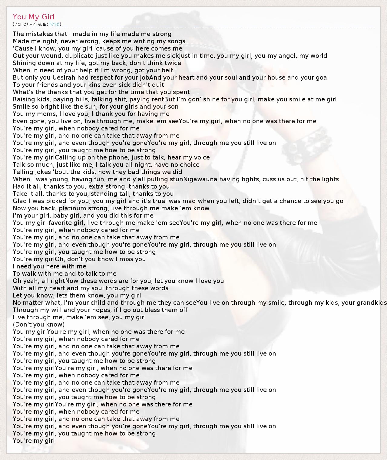 The mistakes that I made in my life made me strong Made me right, never wrong, keeps me writing my songs 'Cause I know, you my girl 'cause of you here comes me Out your wound, duplicate just like you makes me sickJust in time, you my girl, you my angel, my world Shining down at my life, got my back, don't think twice When in need of your help if I'm wrong, got your belt But only you Uesirah had respect for your jobAnd your heart and your soul and your house and your goal To your friends and your kins even sick didn't quit What's the thanks that you get for the time that you spent Raising kids, paying bills, talking shit, paying rentBut I'm gon' shine for you girl, make you smile at me girl Smile so bright like the sun, for your girls and your son You my moms, I love you, I thank you for having me Even gone, you live on, live through me, make 'em seeYou're my girl, when no one was there for me You're my girl, when nobody cared for me You're my girl, and no one can take that away from me You're my girl, and even though you're goneYou're my girl, through me you still live on You're my girl, you taught me how to be strong You're my girlCalling up on the phone, just to talk, hear my voice Talk so much, just like me, I talk you all night, have no choice Telling jokes 'bout the kids, how they bad things we did When I was young, having fun, me and y'all pulling stunNigawauna having fights, cuss us out, hit the lights Had it all, thanks to you, extra strong, thanks to you Take it all, thanks to you, standing tall, thanks to you Glad I was picked for you, you my girl and it's trueI was mad when you left, didn't get a chance to see you go Now you back, platinum strong, live through me make 'em know I'm your girl, baby girl, and you did this for me You my girl favorite girl, live through me make 'em seeYou're my girl, when no one was there for me You're my girl, when nobody cared for me You're my girl, and no one can take that away from me You're my girl, and even though you're goneYou're my girl, through me you still live on You're my girl, you taught me how to be strong You're my girlOh, don't you know I miss you I need you here with me To walk with me and to talk to me Oh yeah, all rightNow these words are for you, let you know I love you With all my heart and my soul through these words Let you know, lets them know, you my girl No matter what, I'm your child and through me they can seeYou live on through my smile, through my kids, your grandkids Through my will and your hopes, if I go out bless them off Live through me, make 'em see, you my girl (Don't you know) You my girlYou're my girl, when no one was there for me You're my girl, when nobody cared for me You're my girl, and no one can take that away from me You're my girl, and even though you're goneYou're my girl, through me you still live on You're my girl, you taught me how to be strong You're my girlYou're my girl, when no one was there for me You're my girl, when nobody cared for me You're my girl, and no one can take that away from me You're my girl, and even though you're goneYou're my girl, through me you still live on You're my girl, you taught me how to be strong You're my girlYou're my girl, when no one was there for me You're my girl, when nobody cared for me You're my girl, and no one can take that away from me You're my girl, and even though you're goneYou're my girl, through me you still live on You're my girl, you taught me how to be strong You're my girl