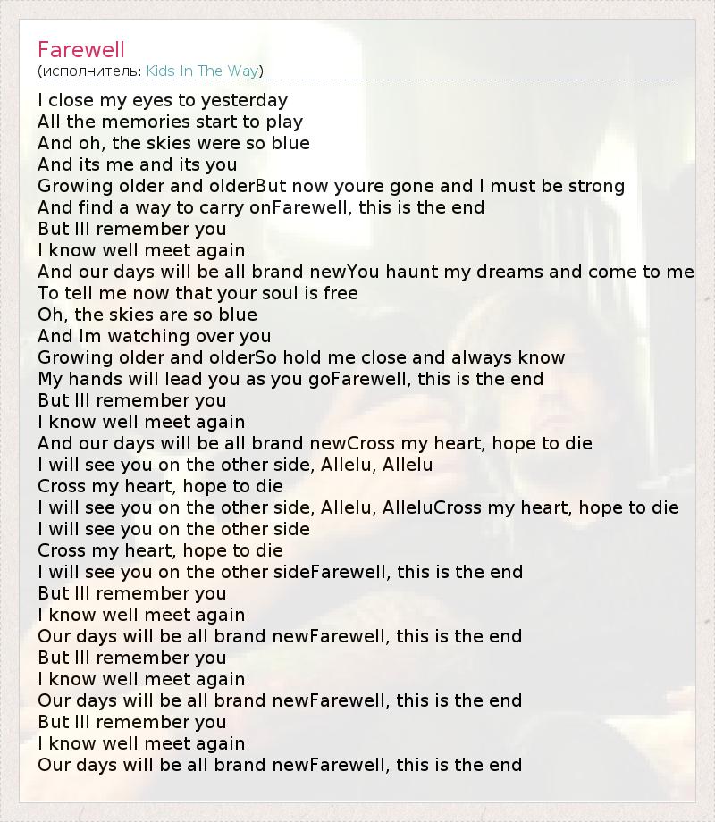 I close my eyes to yesterday All the memories start to play And oh, the skies were so blue And its me and its you Growing older and olderBut now youre gone and I must be strong And find a way to carry onFarewell, this is the end But Ill remember you I know well meet again And our days will be all brand newYou haunt my dreams and come to me To tell me now that your soul is free Oh, the skies are so blue And Im watching over you Growing older and olderSo hold me close and always know My hands will lead you as you goFarewell, this is the end But Ill remember you I know well meet again And our days will be all brand newCross my heart, hope to die I will see you on the other side, Allelu, Allelu Cross my heart, hope to die I will see you on the other side, Allelu, AlleluCross my heart, hope to die I will see you on the other side Cross my heart, hope to die I will see you on the other sideFarewell, this is the end But Ill remember you I know well meet again Our days will be all brand newFarewell, this is the end But Ill remember you I know well meet again Our days will be all brand newFarewell, this is the end But Ill remember you I know well meet again Our days will be all brand newFarewell, this is the end