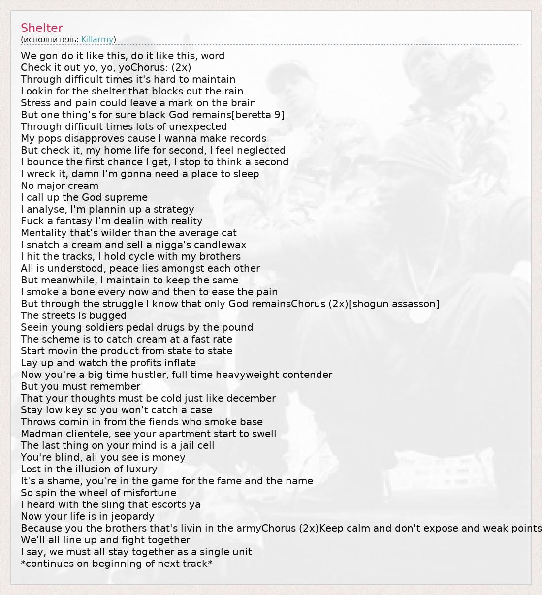 Это интересно:Родом из New York City, USAКоллектив существует с 1995 до настоящего времениЖанр: Хип-ХопЗвукозаписывающие Лэйблы: Priority Records, Relativity RecordsВ состав группы входят: 9th Prince, Dom Pachino, Killa Sin, Islord, Beretta 9, ShoGun Assasson & 4th Disciple Killarmy (произносится как "Killa Army") - рэп-группа, в основном известная как одна из участниц семьи Wu-Fam. Они одни из самых ранних и наиболее успешных проектов Wu-Tang'а, образовавшихся... продолжение