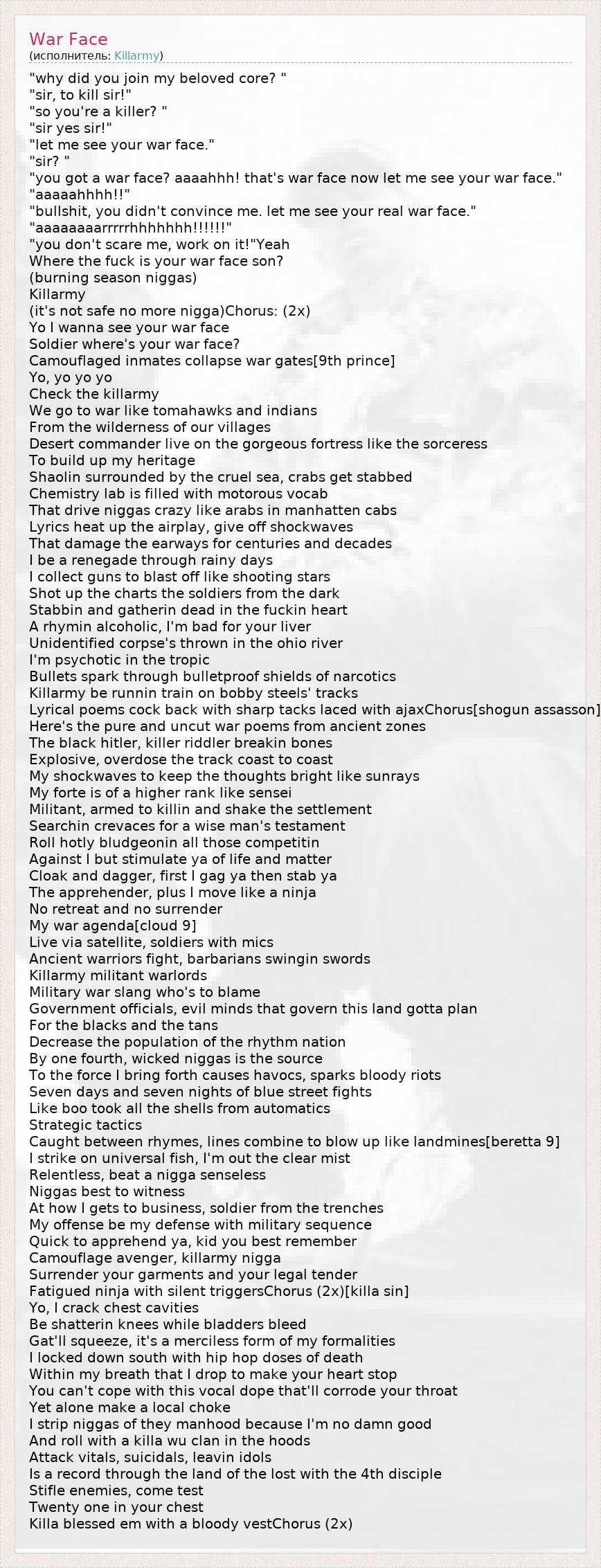 "why did you join my beloved core? " "sir, to kill sir!" "so you're a killer? " "sir yes sir!" "let me see your war face." "sir? " "you got a war face? aaaahhh! that's war face now let me see your war face." "aaaaahhhh!!" "bullshit, you didn't convince me. let me see your real war face." "aaaaaaaarrrrrhhhhhhh!!!!!!" "you don't scare me, work on it!"Yeah Where the fuck is your war face son? (burning season niggas) Killarmy (it's not safe no more nigga)Chorus: (2x) Yo I wanna see your war face Soldier where's your war face? Camouflaged inmates collapse war gates[9th prince] Yo, yo yo yo Check the killarmy We go to war like tomahawks and indians From the wilderness of our villages Desert commander live on the gorgeous fortress like the sorceress To build up my heritage Shaolin surrounded by the cruel sea, crabs get stabbed Chemistry lab is filled with motorous vocab That drive niggas crazy like arabs in manhatten cabs Lyrics heat up the airplay, give off shockwaves That damage the earways for centuries and decades I be a renegade through rainy days I collect guns to blast off like shooting stars Shot up the charts the soldiers from the dark Stabbin and gatherin dead in the fuckin heart A rhymin alcoholic, I'm bad for your liver Unidentified corpse's thrown in the ohio river I'm psychotic in the tropic Bullets spark through bulletproof shields of narcotics Killarmy be runnin train on bobby steels' tracks Lyrical poems cock back with sharp tacks laced with ajaxChorus[shogun assasson] Here's the pure and uncut war poems from ancient zones The black hitler, killer riddler breakin bones Explosive, overdose the track coast to coast My shockwaves to keep the thoughts bright like sunrays My forte is of a higher rank like sensei Militant, armed to killin and shake the settlement Searchin crevaces for a wise man's testament Roll hotly bludgeonin all those competitin Against I but stimulate ya of life and matter Cloak and dagger, first I gag ya then stab ya The apprehender, plus I move like a ninja No retreat and no surrender My war agenda[cloud 9] Live via satellite, soldiers with mics Ancient warriors fight, barbarians swingin swords Killarmy militant warlords Military war slang who's to blame Government officials, evil minds that govern this land gotta plan For the blacks and the tans Decrease the population of the rhythm nation By one fourth, wicked niggas is the source To the force I bring forth causes havocs, sparks bloody riots Seven days and seven nights of blue street fights Like boo took all the shells from automatics Strategic tactics Caught between rhymes, lines combine to blow up like landmines[beretta 9] I strike on universal fish, I'm out the clear mist Relentless, beat a nigga senseless Niggas best to witness At how I gets to business, soldier from the trenches My offense be my defense with military sequence Quick to apprehend ya, kid you best remember Camouflage avenger, killarmy nigga Surrender your garments and your legal tender Fatigued ninja with silent triggersChorus (2x)[killa sin] Yo, I crack chest cavities Be shatterin knees while bladders bleed Gat'll squeeze, it's a merciless form of my formalities I locked down south with hip hop doses of death Within my breath that I drop to make your heart stop You can't cope with this vocal dope that'll corrode your throat Yet alone make a local choke I strip niggas of they manhood because I'm no damn good And roll with a killa wu clan in the hoods Attack vitals, suicidals, leavin idols Is a record through the land of the lost with the 4th disciple Stifle enemies, come test Twenty one in your chest Killa blessed em with a bloody vestChorus (2x)