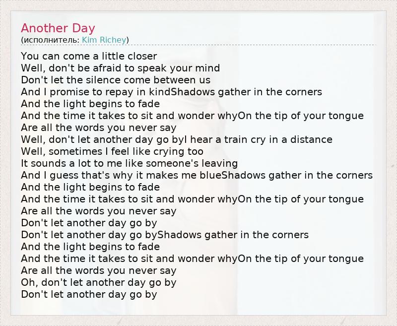You can come a little closer Well, don't be afraid to speak your mind Don't let the silence come between us And I promise to repay in kindShadows gather in the corners And the light begins to fade And the time it takes to sit and wonder whyOn the tip of your tongue Are all the words you never say Well, don't let another day go byI hear a train cry in a distance Well, sometimes I feel like crying too It sounds a lot to me like someone's leaving And I guess that's why it makes me blueShadows gather in the corners And the light begins to fade And the time it takes to sit and wonder whyOn the tip of your tongue Are all the words you never say Don't let another day go by Don't let another day go byShadows gather in the corners And the light begins to fade And the time it takes to sit and wonder whyOn the tip of your tongue Are all the words you never say Oh, don't let another day go by Don't let another day go by