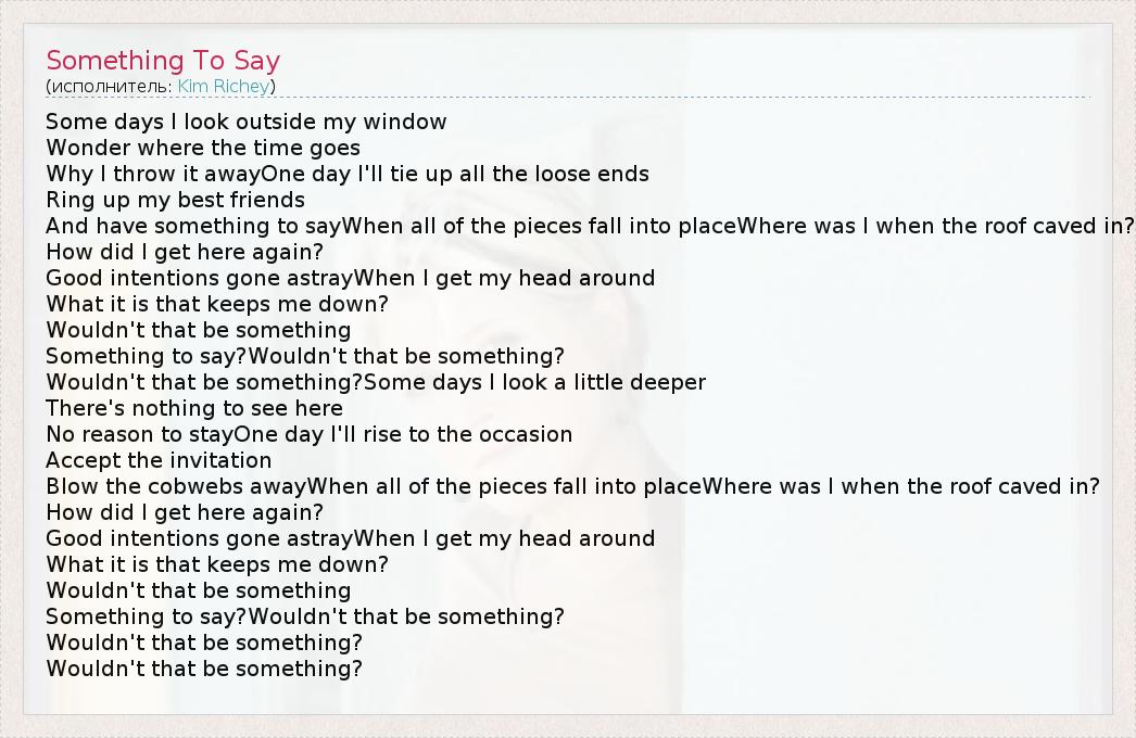 Some days I look outside my window Wonder where the time goes Why I throw it awayOne day I'll tie up all the loose ends Ring up my best friends And have something to sayWhen all of the pieces fall into placeWhere was I when the roof caved in? How did I get here again? Good intentions gone astrayWhen I get my head around What it is that keeps me down? Wouldn't that be something Something to say?Wouldn't that be something? Wouldn't that be something?Some days I look a little deeper There's nothing to see here No reason to stayOne day I'll rise to the occasion Accept the invitation Blow the cobwebs awayWhen all of the pieces fall into placeWhere was I when the roof caved in? How did I get here again? Good intentions gone astrayWhen I get my head around What it is that keeps me down? Wouldn't that be something Something to say?Wouldn't that be something? Wouldn't that be something? Wouldn't that be something?