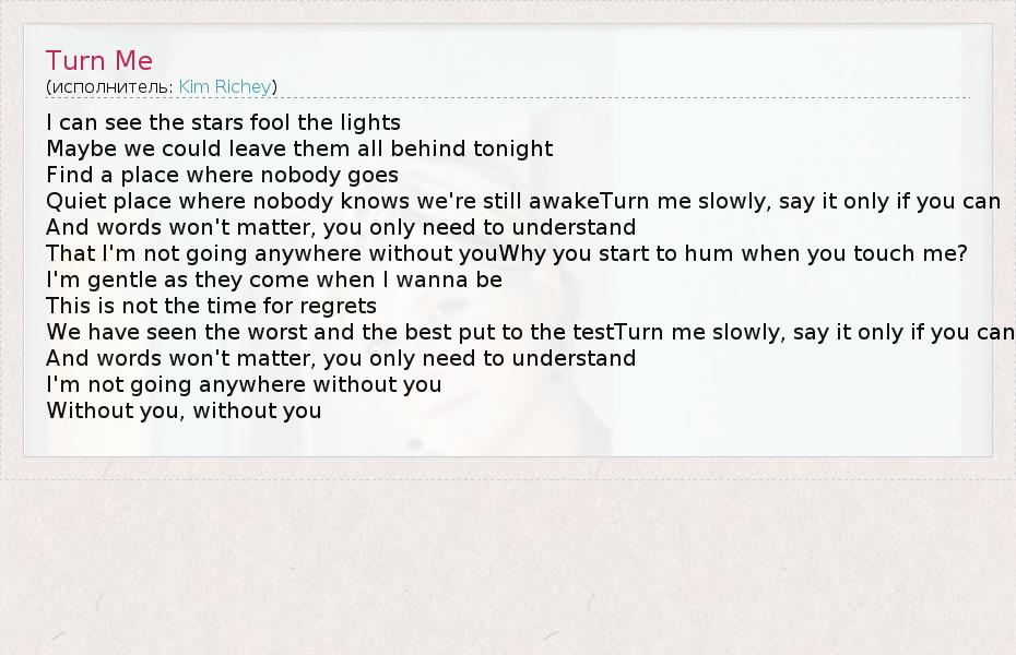 I can see the stars fool the lights Maybe we could leave them all behind tonight Find a place where nobody goes Quiet place where nobody knows we're still awakeTurn me slowly, say it only if you can And words won't matter, you only need to understand That I'm not going anywhere without youWhy you start to hum when you touch me? I'm gentle as they come when I wanna be This is not the time for regrets We have seen the worst and the best put to the testTurn me slowly, say it only if you can And words won't matter, you only need to understand I'm not going anywhere without you Without you, without you