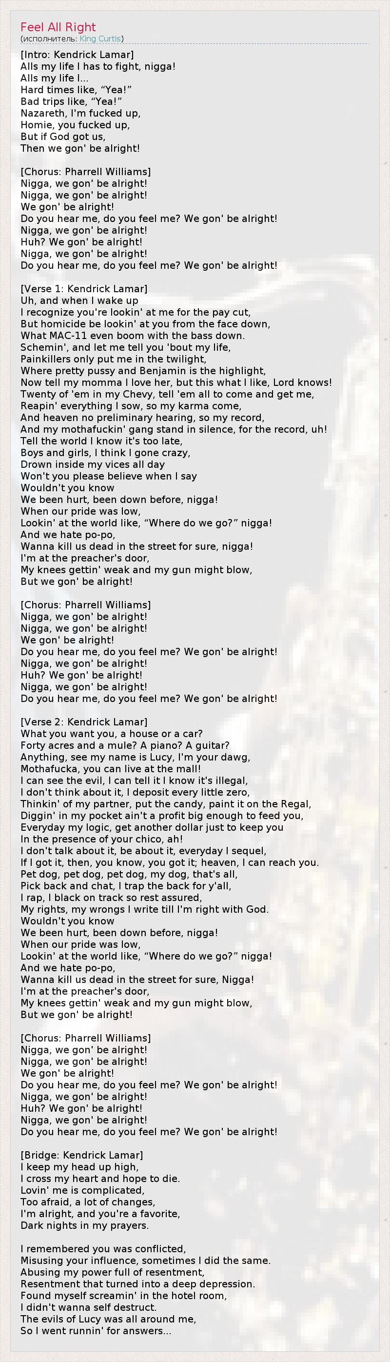 [Вступление: Kendrick Lamar] Всю свою жизнь мне приходилось бороться, ниггер! Всю свою жизнь мне... Тяжкие времена: "Да-а!" Жуткие трипы: "Да-а!" Назарет, я всё про**ал, Братишка, ты в ж**е, Но если мы доверимся Господу, То у нас всё будет в порядке! [Припев: Pharrell Williams] Ниггер, мы будем в порядке! Ниггер, мы будем в порядке! Мы будем в порядке! Ты меня слышишь? Ты меня понимаешь? Мы будем в порядке! Ниггер, мы будем в порядке! А? Мы будем в порядке! Ниггер, мы будем в порядке! Ты меня слышишь? Ты меня понимаешь? Мы будем в порядке! [Куплет 1: Kendrick Lamar] Ух, а когда я проснулся, То понял, что ты смотришь на меня, ожидая снижения доходов, Но насильственная смерть глядит на тебя из глаз упавшего, Которого МАК-11 бахнул даже при выключенных басах. 1 Я строю каверзы, но позвольте рассказать о своей жизни: Обезболивающие лишь погружают меня в сумерки, Где единственные светлые пятна — красивые киски и сотенные купюры, И мне это по душе, а теперь скажите моей маме, что я люблю её, но, видит бог, Их в моей "Шеви" меня ждёт целых двадцать, пускай хватают меня, Пожинаю всё, что посеял, вот она, моя карма, В раю нет предварительного следствия, как и в моём личном деле, И для протокола: моя, мать её, банда ждёт молча, ух! Поведайте миру, я знаю, что уже слишком поздно, Мальчики и девочки, кажется, я сошёл с ума, Каждый день я утопаю в своих грехах, Прошу, неужели вы не поверите, когда я скажу... Разве вы не знали, Что нам причиняли боль, нас унижали и прежде, ниггер! Когда от нашей гордости почти ничего не осталось. Я смотрю на мир: "К чему же мы идём?" — ниггер! И мы ненавидим мусоров, Они точно хотят порешить всех нас на улицах, ниггер! Я стою у двери проповедника, Колени подгибаются, а пистолет может шмальнуть, Но мы будем в порядке! [Припев: Pharrell Williams] Ниггер, мы будем в порядке! Ниггер, мы будем в порядке! Мы будем в порядке! Ты меня слышишь? Ты меня понимаешь? Мы будем в порядке! Ниггер, мы будем в порядке! А? Мы будем в порядке! Ниггер, мы будем в порядке! Ты меня слышишь? Ты меня понимаешь? Мы будем в порядке! [Куплет 2: Kendrick Lamar] Что ты для себя хочешь? Дом или машину? Сорок акров и мула? Пианино? Гитару? 2 Что угодно. Короче, меня зовут Люци, я твой корефан, Да ты сможешь жить в торговом центре, у**юдок! Я вижу зло, могу рассказать о нём, я знаю, что это незаконно, Но не думаю об этом, я кладу в банк каждый нулик, Задумайся о партнёрстве со мной — сможешь обновить краску на своём "Ригале", 3 Копаться в моём кармане не прибыльно настолько, чтобы насытить тебя, Моя каждодневная логика: зарабатывай доллары каждый день, чтобы не Отставать от своего братишки, а! Я не говорю, а делаю, повторяю каждый день, Есть у меня — есть и у тебя. Небо, я могу дотянуться до тебя. Собачка, собачка, собачка, мой пёс, вот и всё, Развалился и заговорил, я снова банчу ради всех вас. Я читаю рэп, я чёрный по жизни, остальное прилагается, Я буду описывать свою правду и свои заблуждения, пока не буду в мире с Богом. Разве вы не знали, Что нам причиняли боль, нас унижали и прежде, ниггер! Когда от нашей гордости почти ничего не осталось. Я смотрю на мир: "К чему же мы идём?" — ниггер! И мы ненавидим мусоров, Они точно хотят порешить всех нас на улицах, ниггер! Я стою у двери проповедника, Колени подгибаются, а пистолет может шмальнуть, Но мы будем в порядке! [Припев: Pharrell Williams] Ниггер, мы будем в порядке! Ниггер, мы будем в порядке! Мы будем в порядке! Ты меня слышишь? Ты меня по