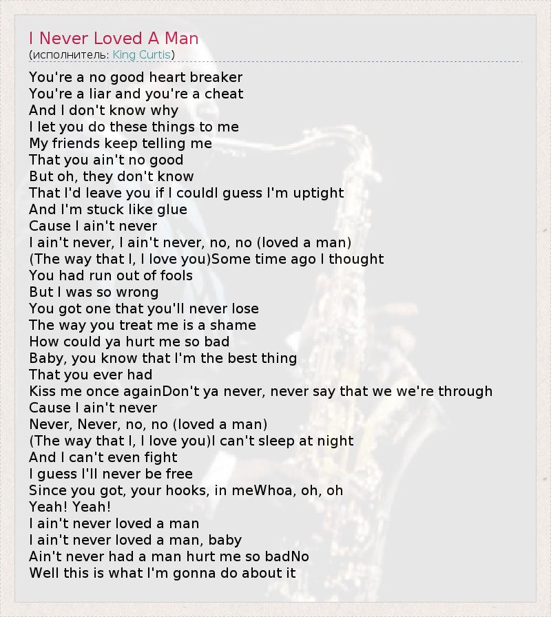 You're a no good heart breaker You're a liar and you're a cheat And I don't know why I let you do these things to me My friends keep telling me That you ain't no good But oh, they don't know That I'd leave you if I couldI guess I'm uptight And I'm stuck like glue Cause I ain't never I ain't never, I ain't never, no, no (loved a man) (The way that I, I love you)Some time ago I thought You had run out of fools But I was so wrong You got one that you'll never lose The way you treat me is a shame How could ya hurt me so bad Baby, you know that I'm the best thing That you ever had Kiss me once againDon't ya never, never say that we we're through Cause I ain't never Never, Never, no, no (loved a man) (The way that I, I love you)I can't sleep at night And I can't even fight I guess I'll never be free Since you got, your hooks, in meWhoa, oh, oh Yeah! Yeah! I ain't never loved a man I ain't never loved a man, baby Ain't never had a man hurt me so badNo Well this is what I'm gonna do about it