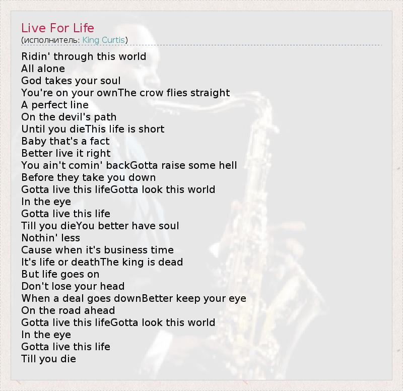 Ridin' through this world All alone God takes your soul You're on your ownThe crow flies straight A perfect line On the devil's path Until you dieThis life is short Baby that's a fact Better live it right You ain't comin' backGotta raise some hell Before they take you down Gotta live this lifeGotta look this world In the eye Gotta live this life Till you dieYou better have soul Nothin' less Cause when it's business time It's life or deathThe king is dead But life goes on Don't lose your head When a deal goes downBetter keep your eye On the road ahead Gotta live this lifeGotta look this world In the eye Gotta live this life Till you die