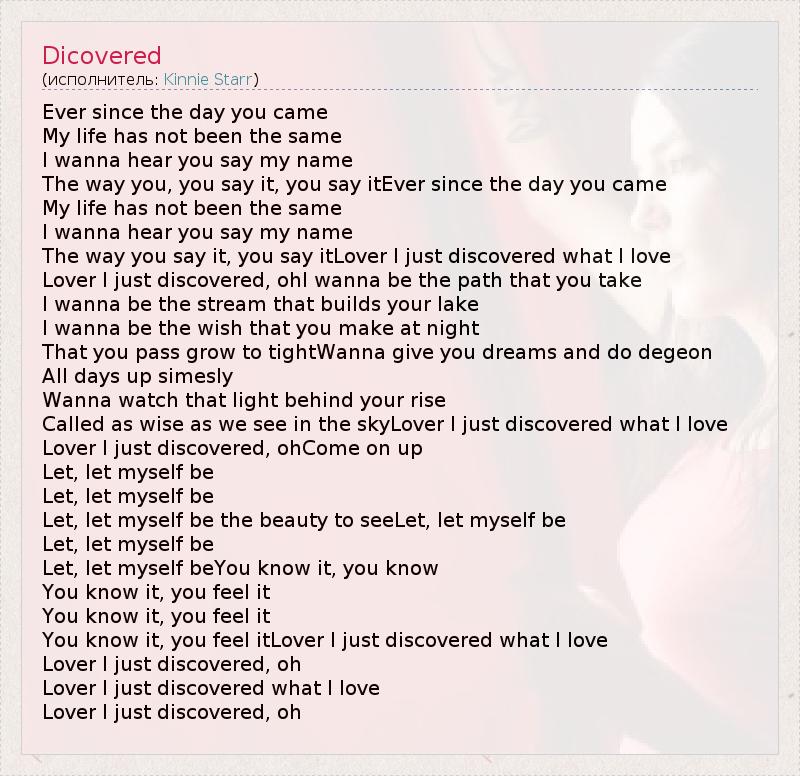 Ever since the day you came My life has not been the same I wanna hear you say my name The way you, you say it, you say itEver since the day you came My life has not been the same I wanna hear you say my name The way you say it, you say itLover I just discovered what I love Lover I just discovered, ohI wanna be the path that you take I wanna be the stream that builds your lake I wanna be the wish that you make at night That you pass grow to tightWanna give you dreams and do degeon All days up simesly Wanna watch that light behind your rise Called as wise as we see in the skyLover I just discovered what I love Lover I just discovered, ohCome on up Let, let myself be Let, let myself be Let, let myself be the beauty to seeLet, let myself be Let, let myself be Let, let myself beYou know it, you know You know it, you feel it You know it, you feel it You know it, you feel itLover I just discovered what I love Lover I just discovered, oh Lover I just discovered what I love Lover I just discovered, oh