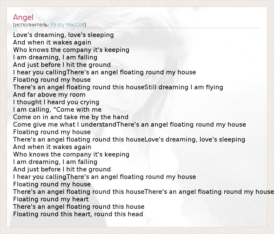 Love's dreaming, love's sleeping And when it wakes again Who knows the company it's keeping I am dreaming, I am falling And just before I hit the ground I hear you callingThere's an angel floating round my house Floating round my house There's an angel floating round this houseStill dreaming I am flying And far above my room I thought I heard you crying I am calling, "Come with me Come on in and take me by the hand Come give me what I understandThere's an angel floating round my house Floating round my house There's an angel floating round this houseLove's dreaming, love's sleeping And when it wakes again Who knows the company it's keeping I am dreaming, I am falling And just before I hit the ground I hear you callingThere's an angel floating round my house Floating round my house There's an angel floating round this houseThere's an angel floating round my house Floating round my heart There's an angel floating round this house Floating round this heart, round this head