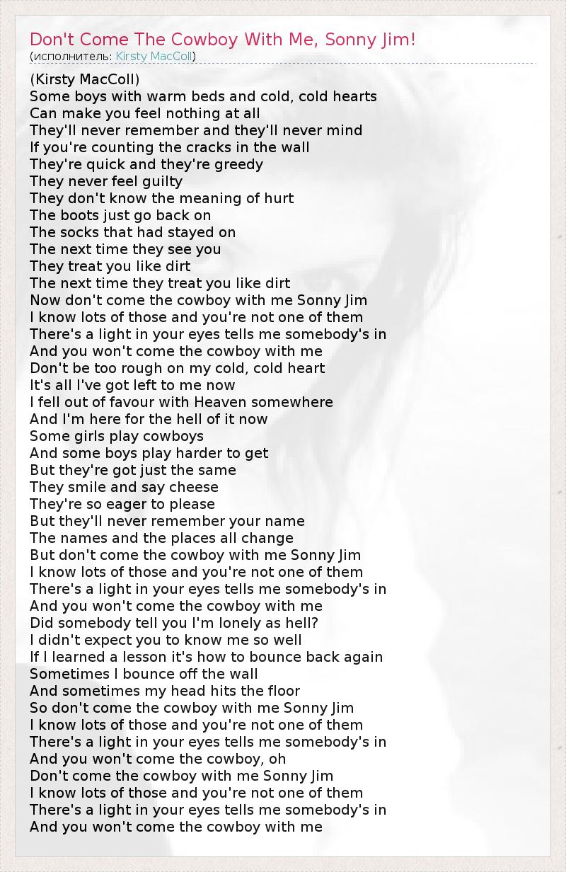 (Kirsty MacColl) Some boys with warm beds and cold, cold hearts Can make you feel nothing at all They'll never remember and they'll never mind If you're counting the cracks in the wall They're quick and they're greedy They never feel guilty They don't know the meaning of hurt The boots just go back on The socks that had stayed on The next time they see you They treat you like dirt The next time they treat you like dirt Now don't come the cowboy with me Sonny Jim I know lots of those and you're not one of them There's a light in your eyes tells me somebody's in And you won't come the cowboy with me Don't be too rough on my cold, cold heart It's all I've got left to me now I fell out of favour with Heaven somewhere And I'm here for the hell of it now Some girls play cowboys And some boys play harder to get But they're got just the same They smile and say cheese They're so eager to please But they'll never remember your name The names and the places all change But don't come the cowboy with me Sonny Jim I know lots of those and you're not one of them There's a light in your eyes tells me somebody's in And you won't come the cowboy with me Did somebody tell you I'm lonely as hell? I didn't expect you to know me so well If I learned a lesson it's how to bounce back again Sometimes I bounce off the wall And sometimes my head hits the floor So don't come the cowboy with me Sonny Jim I know lots of those and you're not one of them There's a light in your eyes tells me somebody's in And you won't come the cowboy, oh Don't come the cowboy with me Sonny Jim I know lots of those and you're not one of them There's a light in your eyes tells me somebody's in And you won't come the cowboy with me