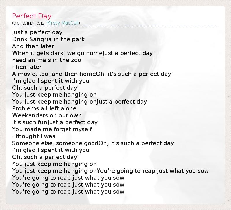 Just a perfect day Drink Sangria in the park And then later When it gets dark, we go homeJust a perfect day Feed animals in the zoo Then later A movie, too, and then homeOh, it's such a perfect day I'm glad I spent it with you Oh, such a perfect day You just keep me hanging on You just keep me hanging onJust a perfect day Problems all left alone Weekenders on our own It's such funJust a perfect day You made me forget myself I thought I was Someone else, someone goodOh, it's such a perfect day I'm glad I spent it with you Oh, such a perfect day You just keep me hanging on You just keep me hanging onYou're going to reap just what you sow You're going to reap just what you sow You're going to reap just what you sow You're going to reap just what you sow