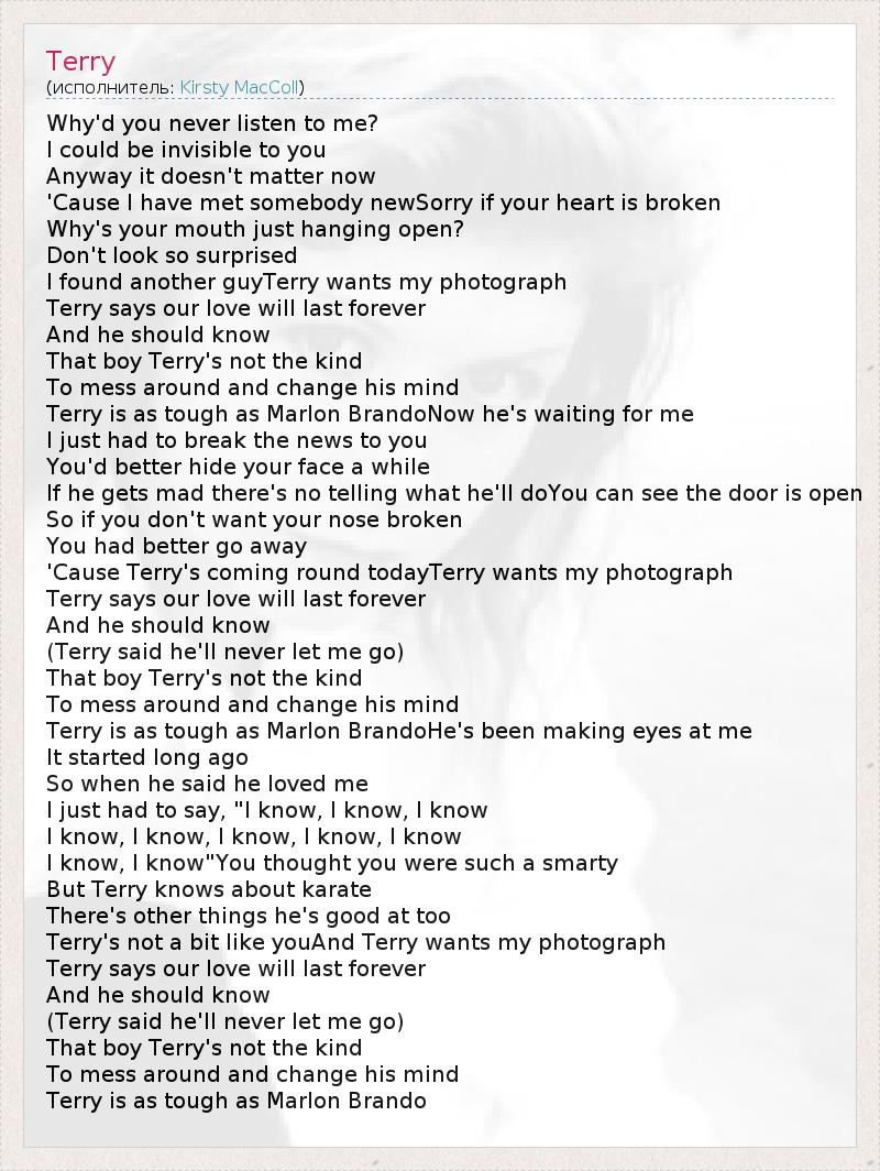 Why'd you never listen to me? I could be invisible to you Anyway it doesn't matter now 'Cause I have met somebody newSorry if your heart is broken Why's your mouth just hanging open? Don't look so surprised I found another guyTerry wants my photograph Terry says our love will last forever And he should know That boy Terry's not the kind To mess around and change his mind Terry is as tough as Marlon BrandoNow he's waiting for me I just had to break the news to you You'd better hide your face a while If he gets mad there's no telling what he'll doYou can see the door is open So if you don't want your nose broken You had better go away 'Cause Terry's coming round todayTerry wants my photograph Terry says our love will last forever And he should know (Terry said he'll never let me go) That boy Terry's not the kind To mess around and change his mind Terry is as tough as Marlon BrandoHe's been making eyes at me It started long ago So when he said he loved me I just had to say, "I know, I know, I know I know, I know, I know, I know, I know I know, I know"You thought you were such a smarty But Terry knows about karate There's other things he's good at too Terry's not a bit like youAnd Terry wants my photograph Terry says our love will last forever And he should know (Terry said he'll never let me go) That boy Terry's not the kind To mess around and change his mind Terry is as tough as Marlon Brando