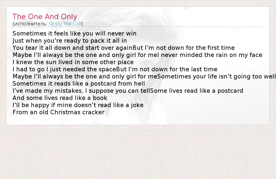 Sometimes it feels like you will never win Just when you're ready to pack it all in You tear it all down and start over againBut I'm not down for the first time Maybe I'll always be the one and only girl for meI never minded the rain on my face I knew the sun lived in some other place I had to go I just needed the spaceBut I'm not down for the last time Maybe I'll always be the one and only girl for meSometimes your life isn't going too well Sometimes it reads like a postcard from hell I've made my mistakes, I suppose you can tellSome lives read like a postcard And some lives read like a book I'll be happy if mine doesn't read like a joke From an old Christmas cracker