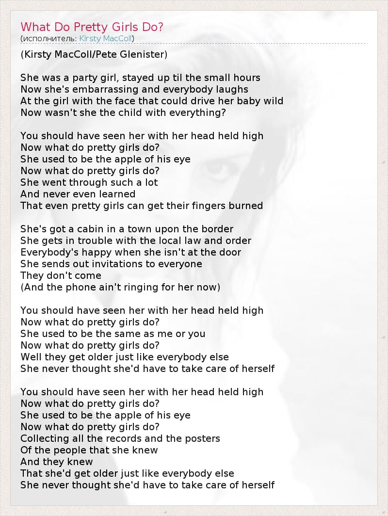 (Kirsty MacColl/Pete Glenister) She was a party girl, stayed up til the small hours Now she's embarrassing and everybody laughs At the girl with the face that could drive her baby wild Now wasn't she the child with everything? You should have seen her with her head held high Now what do pretty girls do? She used to be the apple of his eye Now what do pretty girls do? She went through such a lot And never even learned That even pretty girls can get their fingers burned She's got a cabin in a town upon the border She gets in trouble with the local law and order Everybody's happy when she isn't at the door She sends out invitations to everyone They don't come (And the phone ain't ringing for her now) You should have seen her with her head held high Now what do pretty girls do? She used to be the same as me or you Now what do pretty girls do? Well they get older just like everybody else She never thought she'd have to take care of herself You should have seen her with her head held high Now what do pretty girls do? She used to be the apple of his eye Now what do pretty girls do? Collecting all the records and the posters Of the people that she knew And they knew That she'd get older just like everybody else She never thought she'd have to take care of herself