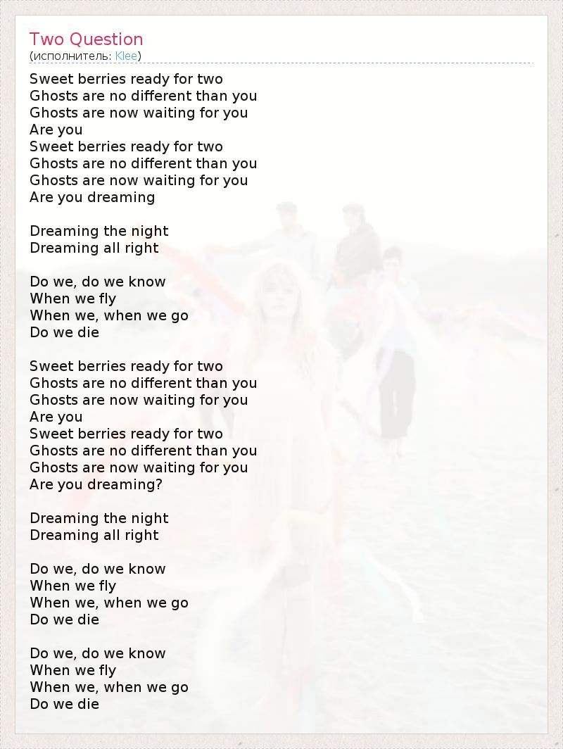 Сладкие ягоды уже созрели для двух Призраков, так похожих на тебя Призраки уже ждут тебя Ты...? Сладкие ягоды, уже созрели для двух Призраков, так похожих на тебя Призраки уже ждут тебя Ты спишь? Спишь ночью Спишь... отлично Ты же, ты же знаешь Когда мы летаем Когда мы, когда мы идем Умирать Сладкие ягоды, уже созрели для двух Призраков, так похожих на тебя Призраки уже ждут тебя Ты...? Сладкие ягоды уже созрели для двух Призраков, так похожих на тебя Призраки уже ждут тебя Ты спишь? Спишь ночью Спишь... отлично Ты же, ты же знаешь Когда мы летаем Когда мы, когда мы идем Умирать Ты же, ты же знаешь Когда мы летаем Когда мы, когда мы идем Умирать