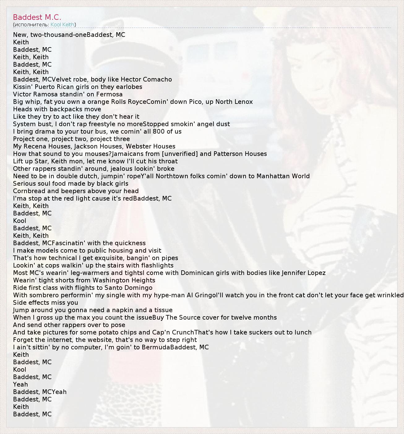 New, two-thousand-oneBaddest, MC Keith Baddest, MC Keith, Keith Baddest, MC Keith, Keith Baddest, MCVelvet robe, body like Hector Comacho Kissin' Puerto Rican girls on they earlobes Victor Ramosa standin' on Fermosa Big whip, fat you own a orange Rolls RoyceComin' down Pico, up North Lenox Heads with backpacks move Like they try to act like they don't hear it System bust, I don't rap freestyle no moreStopped smokin' angel dust I bring drama to your tour bus, we comin' all 800 of us Project one, project two, project three My Recena Houses, Jackson Houses, Webster Houses How that sound to you mouses?Jamaicans from [unverified] and Patterson Houses Lift up Star, Keith mon, let me know I'll cut his throat Other rappers standin' around, jealous lookin' broke Need to be in double dutch, jumpin' ropeY'all Northtown folks comin' down to Manhattan World Serious soul food made by black girls Cornbread and beepers above your head I'ma stop at the red light cause it's redBaddest, MC Keith, Keith Baddest, MC Kool Baddest, MC Keith, Keith Baddest, MCFascinatin' with the quickness I make models come to public housing and visit That's how technical I get exquisite, bangin' on pipes Lookin' at cops walkin' up the stairs with flashlights Most MC's wearin' leg-warmers and tightsI come with Dominican girls with bodies like Jennifer Lopez Wearin' tight shorts from Washington Heights Ride first class with flights to Santo Domingo With sombrero performin' my single with my hype-man Al GringoI'll watch you in the front cat don't let your face get wrinkled Side effects miss you Jump around you gonna need a napkin and a tissue When I gross up the max you count the issueBuy The Source cover for twelve months And send other rappers over to pose And take pictures for some potato chips and Cap'n CrunchThat's how I take suckers out to lunch Forget the internet, the website, that's no way to step right I ain't sittin' by no computer, I'm goin' to BermudaBaddest, MC Keith Baddest, MC Kool Baddest, MC Yeah Baddest, MCYeah Baddest, MC Keith Baddest, MC
