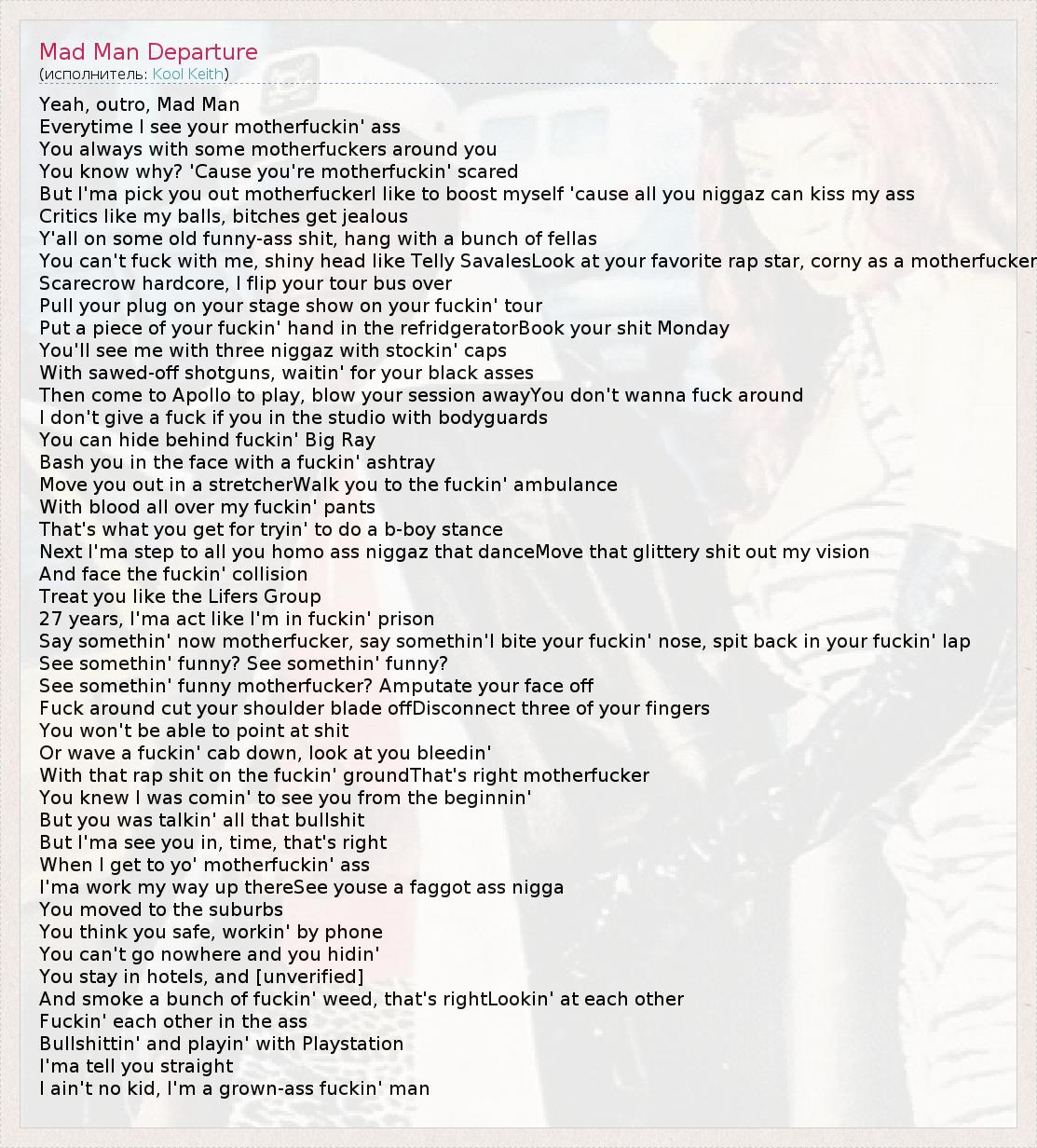 Yeah, outro, Mad Man Everytime I see your motherfuckin' ass You always with some motherfuckers around you You know why? 'Cause you're motherfuckin' scared But I'ma pick you out motherfuckerI like to boost myself 'cause all you niggaz can kiss my ass Critics like my balls, bitches get jealous Y'all on some old funny-ass shit, hang with a bunch of fellas You can't fuck with me, shiny head like Telly SavalesLook at your favorite rap star, corny as a motherfucker Scarecrow hardcore, I flip your tour bus over Pull your plug on your stage show on your fuckin' tour Put a piece of your fuckin' hand in the refridgeratorBook your shit Monday You'll see me with three niggaz with stockin' caps With sawed-off shotguns, waitin' for your black asses Then come to Apollo to play, blow your session awayYou don't wanna fuck around I don't give a fuck if you in the studio with bodyguards You can hide behind fuckin' Big Ray Bash you in the face with a fuckin' ashtray Move you out in a stretcherWalk you to the fuckin' ambulance With blood all over my fuckin' pants That's what you get for tryin' to do a b-boy stance Next I'ma step to all you homo ass niggaz that danceMove that glittery shit out my vision And face the fuckin' collision Treat you like the Lifers Group 27 years, I'ma act like I'm in fuckin' prison Say somethin' now motherfucker, say somethin'I bite your fuckin' nose, spit back in your fuckin' lap See somethin' funny? See somethin' funny? See somethin' funny motherfucker? Amputate your face off Fuck around cut your shoulder blade offDisconnect three of your fingers You won't be able to point at shit Or wave a fuckin' cab down, look at you bleedin' With that rap shit on the fuckin' groundThat's right motherfucker You knew I was comin' to see you from the beginnin' But you was talkin' all that bullshit But I'ma see you in, time, that's right When I get to yo' motherfuckin' ass I'ma work my way up thereSee youse a faggot ass nigga You moved to the suburbs You think you safe, workin' by phone You can't go nowhere and you hidin' You stay in hotels, and [unverified] And smoke a bunch of fuckin' weed, that's rightLookin' at each other Fuckin' each other in the ass Bullshittin' and playin' with Playstation I'ma tell you straight I ain't no kid, I'm a grown-ass fuckin' man