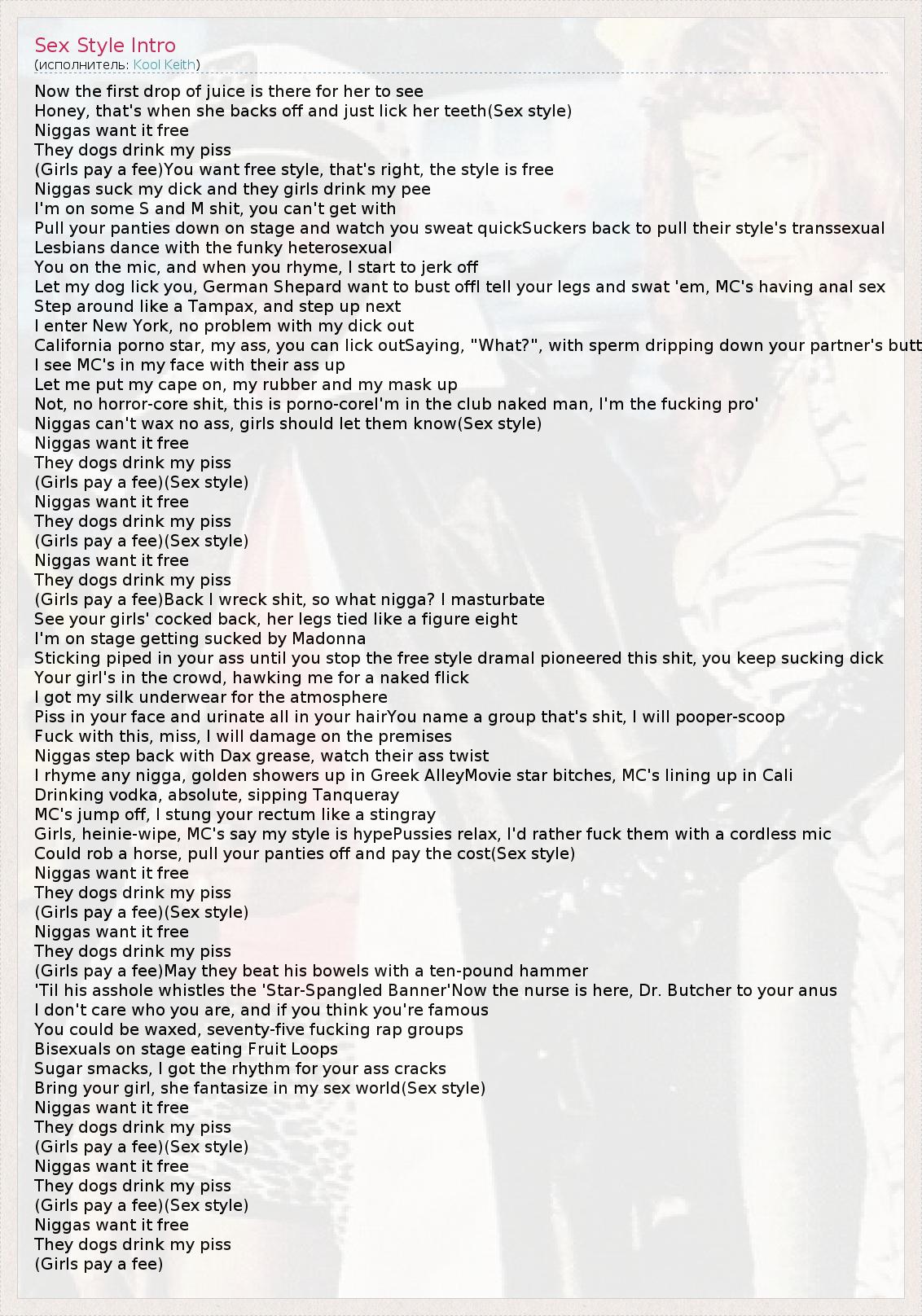 Now the first drop of juice is there for her to see Honey, that's when she backs off and just lick her teeth(Sex style) Niggas want it free They dogs drink my piss (Girls pay a fee)You want free style, that's right, the style is free Niggas suck my dick and they girls drink my pee I'm on some S and M shit, you can't get with Pull your panties down on stage and watch you sweat quickSuckers back to pull their style's transsexual Lesbians dance with the funky heterosexual You on the mic, and when you rhyme, I start to jerk off Let my dog lick you, German Shepard want to bust offI tell your legs and swat 'em, MC's having anal sex Step around like a Tampax, and step up next I enter New York, no problem with my dick out California porno star, my ass, you can lick outSaying, "What?", with sperm dripping down your partner's butt I see MC's in my face with their ass up Let me put my cape on, my rubber and my mask up Not, no horror-core shit, this is porno-coreI'm in the club naked man, I'm the fucking pro' Niggas can't wax no ass, girls should let them know(Sex style) Niggas want it free They dogs drink my piss (Girls pay a fee)(Sex style) Niggas want it free They dogs drink my piss (Girls pay a fee)(Sex style) Niggas want it free They dogs drink my piss (Girls pay a fee)Back I wreck shit, so what nigga? I masturbate See your girls' cocked back, her legs tied like a figure eight I'm on stage getting sucked by Madonna Sticking piped in your ass until you stop the free style dramaI pioneered this shit, you keep sucking dick Your girl's in the crowd, hawking me for a naked flick I got my silk underwear for the atmosphere Piss in your face and urinate all in your hairYou name a group that's shit, I will pooper-scoop Fuck with this, miss, I will damage on the premises Niggas step back with Dax grease, watch their ass twist I rhyme any nigga, golden showers up in Greek AlleyMovie star bitches, MC's lining up in Cali Drinking vodka, absolute, sipping Tanqueray MC's jump off, I stung your rectum like a stingray Girls, heinie-wipe, MC's say my style is hypePussies relax, I'd rather fuck them with a cordless mic Could rob a horse, pull your panties off and pay the cost(Sex style) Niggas want it free They dogs drink my piss (Girls pay a fee)(Sex style) Niggas want it free They dogs drink my piss (Girls pay a fee)May they beat his bowels with a ten-pound hammer 'Til his asshole whistles the 'Star-Spangled Banner'Now the nurse is here, Dr. Butcher to your anus I don't care who you are, and if you think you're famous You could be waxed, seventy-five fucking rap groups Bisexuals on stage eating Fruit Loops Sugar smacks, I got the rhythm for your ass cracks Bring your girl, she fantasize in my sex world(Sex style) Niggas want it free They dogs drink my piss (Girls pay a fee)(Sex style) Niggas want it free They dogs drink my piss (Girls pay a fee)(Sex style) Niggas want it free They dogs drink my piss (Girls pay a fee)