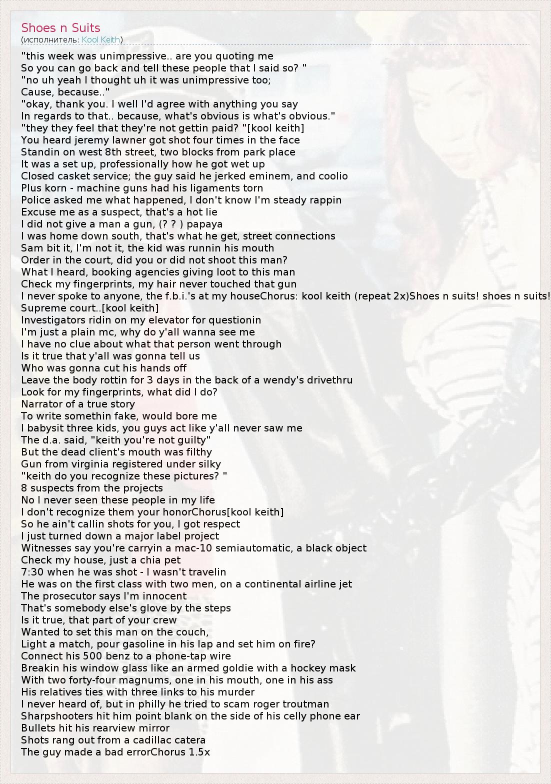 "this week was unimpressive.. are you quoting me So you can go back and tell these people that I said so? " "no uh yeah I thought uh it was unimpressive too; Cause, because.." "okay, thank you. I well I'd agree with anything you say In regards to that.. because, what's obvious is what's obvious." "they they feel that they're not gettin paid? "[kool keith] You heard jeremy lawner got shot four times in the face Standin on west 8th street, two blocks from park place It was a set up, professionally how he got wet up Closed casket service; the guy said he jerked eminem, and coolio Plus korn - machine guns had his ligaments torn Police asked me what happened, I don't know I'm steady rappin Excuse me as a suspect, that's a hot lie I did not give a man a gun, (? ? ) papaya I was home down south, that's what he get, street connections Sam bit it, I'm not it, the kid was runnin his mouth Order in the court, did you or did not shoot this man? What I heard, booking agencies giving loot to this man Check my fingerprints, my hair never touched that gun I never spoke to anyone, the f.b.i.'s at my houseChorus: kool keith (repeat 2x)Shoes n suits! shoes n suits! Supreme court..[kool keith] Investigators ridin on my elevator for questionin I'm just a plain mc, why do y'all wanna see me I have no clue about what that person went through Is it true that y'all was gonna tell us Who was gonna cut his hands off Leave the body rottin for 3 days in the back of a wendy's drivethru Look for my fingerprints, what did I do? Narrator of a true story To write somethin fake, would bore me I babysit three kids, you guys act like y'all never saw me The d.a. said, "keith you're not guilty" But the dead client's mouth was filthy Gun from virginia registered under silky "keith do you recognize these pictures? " 8 suspects from the projects No I never seen these people in my life I don't recognize them your honorChorus[kool keith] So he ain't callin shots for you, I got respect I just turned down a major label project Witnesses say you're carryin a mac-10 semiautomatic, a black object Check my house, just a chia pet 7:30 when he was shot - I wasn't travelin He was on the first class with two men, on a continental airline jet The prosecutor says I'm innocent That's somebody else's glove by the steps Is it true, that part of your crew Wanted to set this man on the couch, Light a match, pour gasoline in his lap and set him on fire? Connect his 500 benz to a phone-tap wire Breakin his window glass like an armed goldie with a hockey mask With two forty-four magnums, one in his mouth, one in his ass His relatives ties with three links to his murder I never heard of, but in philly he tried to scam roger troutman Sharpshooters hit him point blank on the side of his celly phone ear Bullets hit his rearview mirror Shots rang out from a cadillac catera The guy made a bad errorChorus 1.5x