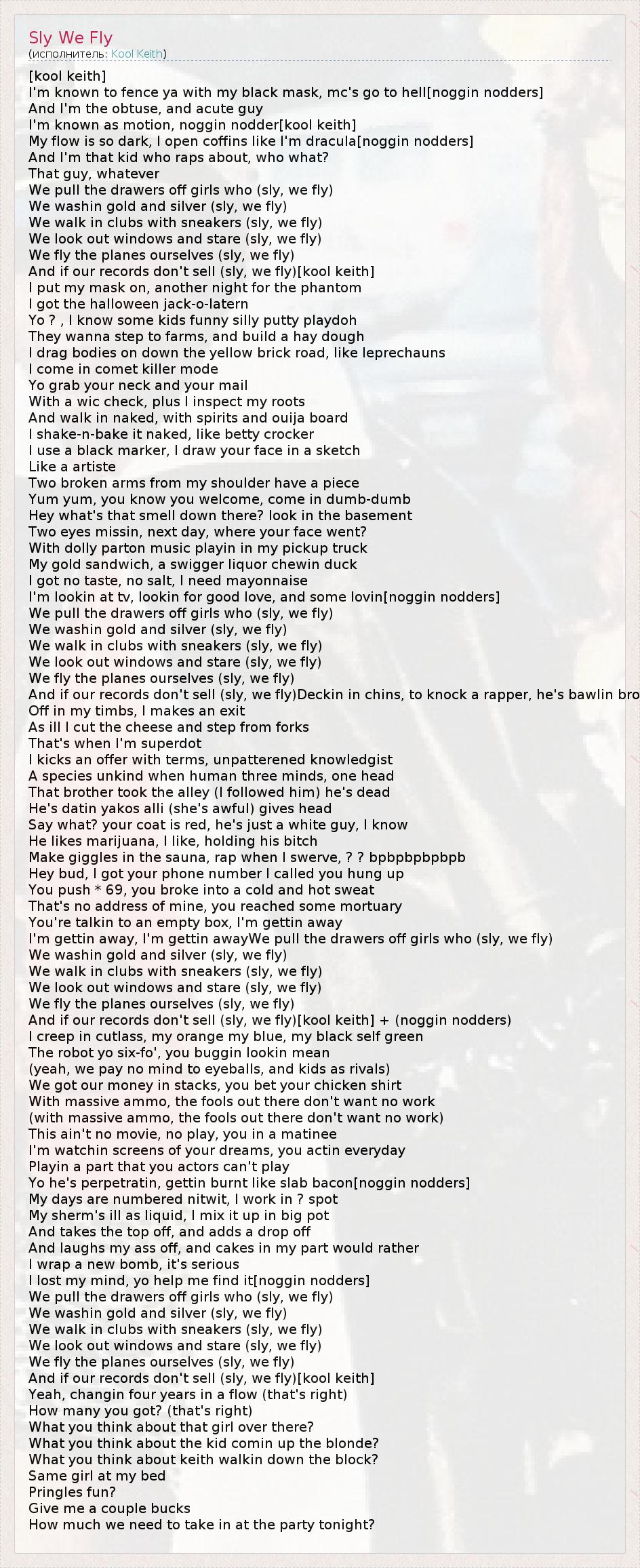[kool keith] I'm known to fence ya with my black mask, mc's go to hell[noggin nodders] And I'm the obtuse, and acute guy I'm known as motion, noggin nodder[kool keith] My flow is so dark, I open coffins like I'm dracula[noggin nodders] And I'm that kid who raps about, who what? That guy, whatever We pull the drawers off girls who (sly, we fly) We washin gold and silver (sly, we fly) We walk in clubs with sneakers (sly, we fly) We look out windows and stare (sly, we fly) We fly the planes ourselves (sly, we fly) And if our records don't sell (sly, we fly)[kool keith] I put my mask on, another night for the phantom I got the halloween jack-o-latern Yo ? , I know some kids funny silly putty playdoh They wanna step to farms, and build a hay dough I drag bodies on down the yellow brick road, like leprechauns I come in comet killer mode Yo grab your neck and your mail With a wic check, plus I inspect my roots And walk in naked, with spirits and ouija board I shake-n-bake it naked, like betty crocker I use a black marker, I draw your face in a sketch Like a artiste Two broken arms from my shoulder have a piece Yum yum, you know you welcome, come in dumb-dumb Hey what's that smell down there? look in the basement Two eyes missin, next day, where your face went? With dolly parton music playin in my pickup truck My gold sandwich, a swigger liquor chewin duck I got no taste, no salt, I need mayonnaise I'm lookin at tv, lookin for good love, and some lovin[noggin nodders] We pull the drawers off girls who (sly, we fly) We washin gold and silver (sly, we fly) We walk in clubs with sneakers (sly, we fly) We look out windows and stare (sly, we fly) We fly the planes ourselves (sly, we fly) And if our records don't sell (sly, we fly)Deckin in chins, to knock a rapper, he's bawlin bro Off in my timbs, I makes an exit As ill I cut the cheese and step from forks That's when I'm superdot I kicks an offer with terms, unpatterened knowledgist A species unkind when human three minds, one head That brother took the alley (I followed him) he's dead He's datin yakos alli (she's awful) gives head Say what? your coat is red, he's just a white guy, I know He likes marijuana, I like, holding his bitch Make giggles in the sauna, rap when I swerve, ? ? bpbpbpbpbpb Hey bud, I got your phone number I called you hung up You push * 69, you broke into a cold and hot sweat That's no address of mine, you reached some mortuary You're talkin to an empty box, I'm gettin away I'm gettin away, I'm gettin awayWe pull the drawers off girls who (sly, we fly) We washin gold and silver (sly, we fly) We walk in clubs with sneakers (sly, we fly) We look out windows and stare (sly, we fly) We fly the planes ourselves (sly, we fly) And if our records don't sell (sly, we fly)[kool keith] + (noggin nodders) I creep in cutlass, my orange my blue, my black self green The robot yo six-fo', you buggin lookin mean (yeah, we pay no mind to eyeballs, and kids as rivals) We got our money in stacks, you bet your chicken shirt With massive ammo, the fools out there don't want no work (with massive ammo, the fools out there don't want no work) This ain't no movie, no play, you in a matinee I'm watchin screens of your dreams, you actin everyday Playin a part that you actors can't play Yo he's perpetratin, gettin burnt like slab bacon[noggin nodders] My days are numbered nitwit, I work in ? spot My sherm's ill as liquid, I mix it up in big pot And takes the top off, and adds a drop off And laughs my ass off, and cakes in my part would rather I wrap a new bomb, it's serious I lost my mind, yo help me find it[noggin nodders] We pull the drawers off girls who (sly, we fly) We washin gold and silver (sly, we fly) We walk in clubs with sneakers (sly, we fly) We look out windows and stare (sly, we fly) We fly the planes ourselves (sly, we fly) And if our records don't sell (sly, we fly)[kool keith] Yeah, changin four years in a flow (that's right) How many you got? (that's right) What you think about that girl over there? What you think about the kid comin up the blonde? What you think about keith walkin down the block? Same girl at my bed Pringles fun? Give me a couple bucks How much we need to take in at the party tonight?