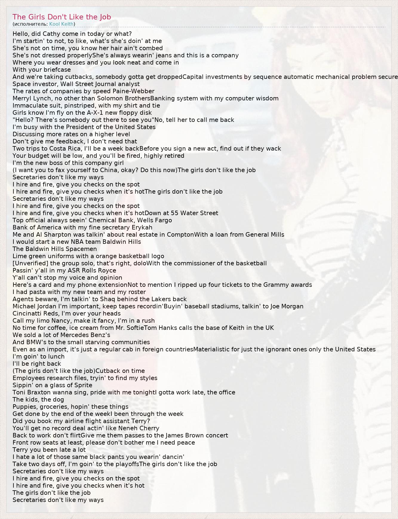 Hello, did Cathy come in today or what? I'm startin' to not, to like, what's she's doin' at me She's not on time, you know her hair ain't combed She's not dressed properlyShe's always wearin' jeans and this is a company Where you wear dresses and you look neat and come in With your briefcase And we're taking cutbacks, somebody gotta get droppedCapital investments by sequence automatic mechanical problem secure Space investor, Wall Street Journal analyst The rates of companies by speed Paine-Webber Merryl Lynch, no other than Solomon BrothersBanking system with my computer wisdom Immaculate suit, pinstriped, with my shirt and tie Girls know I'm fly on the A-X-1 new floppy disk "Hello? There's somebody out there to see you"No, tell her to call me back I'm busy with the President of the United States Discussing more rates on a higher level Don't give me feedback, I don't need that Two trips to Costa Rica, I'll be a week backBefore you sign a new act, find out if they wack Your budget will be low, and you'll be fired, highly retired I'm the new boss of this company girl (I want you to fax yourself to China, okay? Do this now)The girls don't like the job Secretaries don't like my ways I hire and fire, give you checks on the spot I hire and fire, give you checks when it's hotThe girls don't like the job Secretaries don't like my ways I hire and fire, give you checks on the spot I hire and fire, give you checks when it's hotDown at 55 Water Street Top official always seein' Chemical Bank, Wells Fargo Bank of America with my fine secretary Erykah Me and Al Sharpton was talkin' about real estate in ComptonWith a loan from General Mills I would start a new NBA team Baldwin Hills The Baldwin Hills Spacemen Lime green uniforms with a orange basketball logo [Unverified] the group solo, that's right, doloWith the commissioner of the basketball Passin' y'all in my ASR Rolls Royce Y'all can't stop my voice and opinion Here's a card and my phone extensionNot to mention I ripped up four tickets to the Grammy awards I had pasta with my new team and my roster Agents beware, I'm talkin' to Shaq behind the Lakers back Michael Jordan I'm important, keep tapes recordin'Buyin' baseball stadiums, talkin' to Joe Morgan Cincinatti Reds, I'm over your heads Call my limo Nancy, make it fancy, I'm in a rush No time for coffee, ice cream from Mr. SoftieTom Hanks calls the base of Keith in the UK We sold a lot of Mercedes Benz's And BMW's to the small starving communities Even as an import, it's just a regular cab in foreign countriesMaterialistic for just the ignorant ones only the United States I'm goin' to lunch I'll be right back (The girls don't like the job)Cutback on time Employees research files, tryin' to find my styles Sippin' on a glass of Sprite Toni Braxton wanna sing, pride with me tonightI gotta work late, the office The kids, the dog Puppies, groceries, hopin' these things Get done by the end of the weekI been through the week Did you book my airline flight assistant Terry? You'll get no record deal actin' like Neneh Cherry Back to work don't flirtGive me them passes to the James Brown concert Front row seats at least, please don't bother me I need peace Terry you been late a lot I hate a lot of those same black pants you wearin' dancin' Take two days off, I'm goin' to the playoffsThe girls don't like the job Secretaries don't like my ways I hire and fire, give you checks on the spot I hire and fire, give you checks when it's hot The girls don't like the job Secretaries don't like my ways