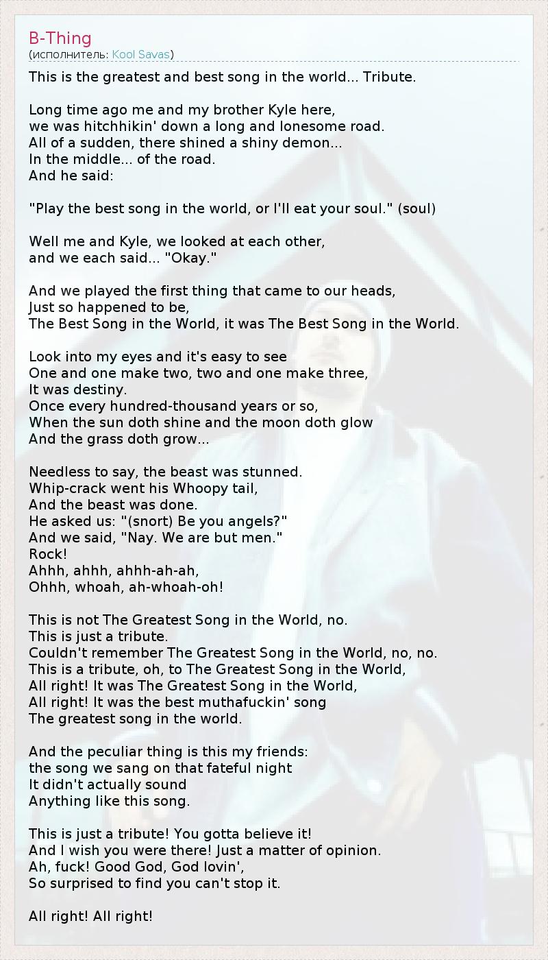 Это величайшая и самая лучшая песня в мире... Трибьют. Как-то раз, я и мой брат Кайл, что сейчас рядом... Автостопом мы двигались по бесконечной, безлюдной дороге. И вдруг, искрящийся демон засиял... Посреди... дороги. И сказал: "Сыграйте лучшую на мире песню, или я сожру ваши души (души)" Что ж, мы с Кайлом переглянулись, и хором сказали... "Окей!" И мы сыграли первое, что пришло в голову. И так уж вышло, что это была Самая Лучшая Песня в Мире, Самая Лучшая Песня в Мире. Взгляни мне в глаза, и ты легко поймёшь, что Один плюс один – это два; два плюс один – это три, Так всегда было. Раз в сотню тысяч лет или около того, Когда сияет солнце, светит луна И растёт трава... Стоит сказать, что чудище было ошеломлено. Стегнуло своим гибким хвостом - И с ним было покончено. Демон спросил нас: "(фыркая) Ангелы?" А мы сказали: "Не. Просто мужики!" Рок! А-ааа, а-ааа, а-а-ааа, О-о, уо-о, а-уо-о! Это не Величайшая Песня в мире, нет, Это лишь трибьют. Не могу припомнить Величайшую в мире Песню, нет, нет. Это лишь трибьют Величайшей Песне в мире. Ну хорошо! Это была Величайшая Песня в мире, Так и быть! Это была лучшая хренова песня, Величайшая песня в мире. И вот что странно, друзья мои: Песня, которую мы спели в ту роковую ночь – Ничто больше не звучало Так, как эта песня. Это лишь трибьют! Вы должны поверить! Как жаль, что вас там не было! Это лишь дело вкуса. Ах, чёрт! Господь милостивый и любящий... Я был удивлён, обнаружив, что ты не можешь выключить эту песню. Отлично! Отлично! * - трибьют – дань памяти либо уважения какому-либо исполнителю. В данном случае – дань "Величайшей в мире Песне".