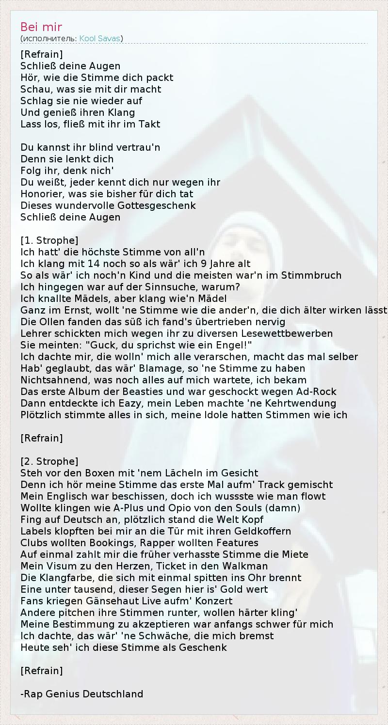[Refrain] Schließ deine Augen Hör, wie die Stimme dich packt Schau, was sie mit dir macht Schlag sie nie wieder auf Und genieß ihren Klang Lass los, fließ mit ihr im Takt Du kannst ihr blind vertrau'n Denn sie lenkt dich Folg ihr, denk nich' Du weißt, jeder kennt dich nur wegen ihr Honorier, was sie bisher für dich tat Dieses wundervolle Gottesgeschenk Schließ deine Augen [1. Strophe] Ich hatt' die höchste Stimme von all'n Ich klang mit 14 noch so als wär' ich 9 Jahre alt So als wär' ich noch'n Kind und die meisten war'n im Stimmbruch Ich hingegen war auf der Sinnsuche, warum? Ich knallte Mädels, aber klang wie'n Mädel Ganz im Ernst, wollt 'ne Stimme wie die ander'n, die dich älter wirken lässt Die Ollen fanden das süß ich fand's übertrieben nervig Lehrer schickten mich wegen ihr zu diversen Lesewettbewerben Sie meinten: "Guck, du sprichst wie ein Engel!" Ich dachte mir, die wolln' mich alle verarschen, macht das mal selber Hab' geglaubt, das wär' Blamage, so 'ne Stimme zu haben Nichtsahnend, was noch alles auf mich wartete, ich bekam Das erste Album der Beasties und war geschockt wegen Ad-Rock Dann entdeckte ich Eazy, mein Leben machte 'ne Kehrtwendung Plötzlich stimmte alles in sich, meine Idole hatten Stimmen wie ich [Refrain] [2. Strophe] Steh vor den Boxen mit 'nem Lächeln im Gesicht Denn ich hör meine Stimme das erste Mal aufm' Track gemischt Mein Englisch war beschissen, doch ich wussste wie man flowt Wollte klingen wie A-Plus und Opio von den Souls (damn) Fing auf Deutsch an, plötzlich stand die Welt Kopf Labels klopften bei mir an die Tür mit ihren Geldkoffern Clubs wollten Bookings, Rapper wollten Features Auf einmal zahlt mir die früher verhasste Stimme die Miete Mein Visum zu den Herzen, Ticket in den Walkman Die Klangfarbe, die sich mit einmal spitten ins Ohr brennt Eine unter tausend, dieser Segen hier is' Gold wert Fans kriegen Gänsehaut Live aufm' Konzert Andere pitchen ihre Stimmen runter, wollen härter kling' Meine Bestimmung zu akzeptieren war anfangs schwer für mich Ich dachte, das wär' 'ne Schwäche, die mich bremst Heute seh' ich diese Stimme als Geschenk [Refrain] -Rap Genius Deutschland