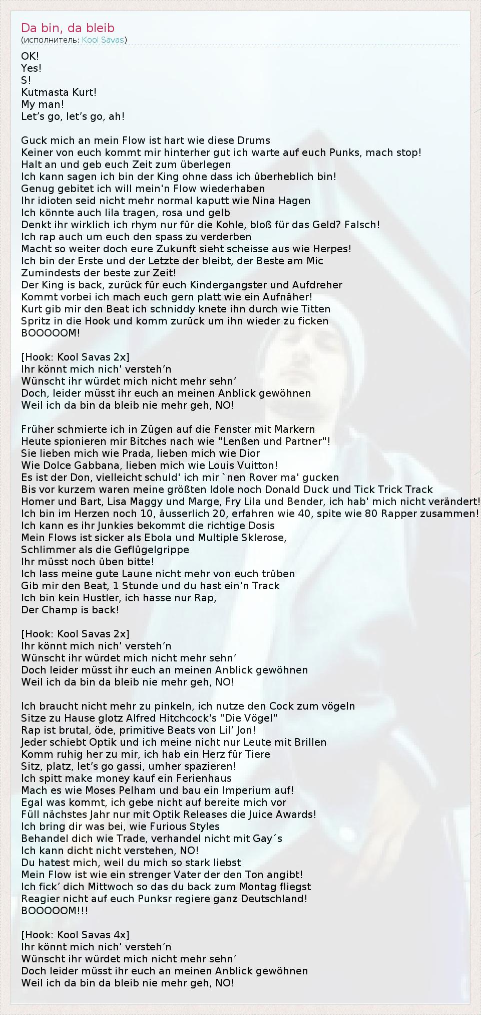 OK! Yes! S! Kutmasta Kurt! My man! Let’s go, let’s go, ah! Guck mich an mein Flow ist hart wie diese Drums Keiner von euch kommt mir hinterher gut ich warte auf euch Punks, mach stop! Halt an und geb euch Zeit zum überlegen Ich kann sagen ich bin der King ohne dass ich überheblich bin! Genug gebitet ich will mein'n Flow wiederhaben Ihr idioten seid nicht mehr normal kaputt wie Nina Hagen Ich könnte auch lila tragen, rosa und gelb Denkt ihr wirklich ich rhym nur für die Kohle, bloß für das Geld? Falsch! Ich rap auch um euch den spass zu verderben Macht so weiter doch eure Zukunft sieht scheisse aus wie Herpes! Ich bin der Erste und der Letzte der bleibt, der Beste am Mic Zumindests der beste zur Zeit! Der King is back, zurück für euch Kindergangster und Aufdreher Kommt vorbei ich mach euch gern platt wie ein Aufnäher! Kurt gib mir den Beat ich schniddy knete ihn durch wie Titten Spritz in die Hook und komm zurück um ihn wieder zu ficken BOOOOOM! [Hook: Kool Savas 2x] Ihr könnt mich nich' versteh’n Wünscht ihr würdet mich nicht mehr sehn’ Doch, leider müsst ihr euch an meinen Anblick gewöhnen Weil ich da bin da bleib nie mehr geh, NO! Früher schmierte ich in Zügen auf die Fenster mit Markern Heute spionieren mir Bitches nach wie "Lenßen und Partner"! Sie lieben mich wie Prada, lieben mich wie Dior Wie Dolce Gabbana, lieben mich wie Louis Vuitton! Es ist der Don, vielleicht schuld' ich mir `nen Rover ma' gucken Bis vor kurzem waren meine größten Idole noch Donald Duck und Tick Trick Track Homer und Bart, Lisa Maggy und Marge, Fry Lila und Bender, ich hab' mich nicht verändert! Ich bin im Herzen noch 10, äusserlich 20, erfahren wie 40, spite wie 80 Rapper zusammen! Ich kann es ihr Junkies bekommt die richtige Dosis Mein Flows ist sicker als Ebola und Multiple Sklerose, Schlimmer als die Geflügelgrippe Ihr müsst noch üben bitte! Ich lass meine gute Laune nicht mehr von euch trüben Gib mir den Beat, 1 Stunde und du hast ein'n Track Ich bin kein Hustler, ich hasse nur Rap, Der Champ is back! [Hook: Kool Savas 2x] Ihr könnt mich nich' versteh’n Wünscht ihr würdet mich nicht mehr sehn’ Doch leider müsst ihr euch an meinen Anblick gewöhnen Weil ich da bin da bleib nie mehr geh, NO! Ich braucht nicht mehr zu pinkeln, ich nutze den Cock zum vögeln Sitze zu Hause glotz Alfred Hitchcock's "Die Vögel" Rap ist brutal, öde, primitive Beats von Lil’ Jon! Jeder schiebt Optik und ich meine nicht nur Leute mit Brillen Komm ruhig her zu mir, ich hab ein Herz für Tiere Sitz, platz, let’s go gassi, umher spazieren! Ich spitt make money kauf ein Ferienhaus Mach es wie Moses Pelham und bau ein Imperium auf! Egal was kommt, ich gebe nicht auf bereite mich vor Füll nächstes Jahr nur mit Optik Releases die Juice Awards! Ich bring dir was bei, wie Furious Styles Behandel dich wie Trade, verhandel nicht mit Gay´s Ich kann dicht nicht verstehen, NO! Du hatest mich, weil du mich so stark liebst Mein Flow ist wie ein strenger Vater der den Ton angibt! Ich fick’ dich Mittwoch so das du back zum Montag fliegst Reagier nicht auf euch Punksr regiere ganz Deutschland! BOOOOOM!!! [Hook: Kool Savas 4x] Ihr könnt mich nich' versteh’n Wünscht ihr würdet mich nicht mehr sehn’ Doch leider müsst ihr euch an meinen Anblick gewöhnen Weil ich da bin da bleib nie mehr geh, NO!