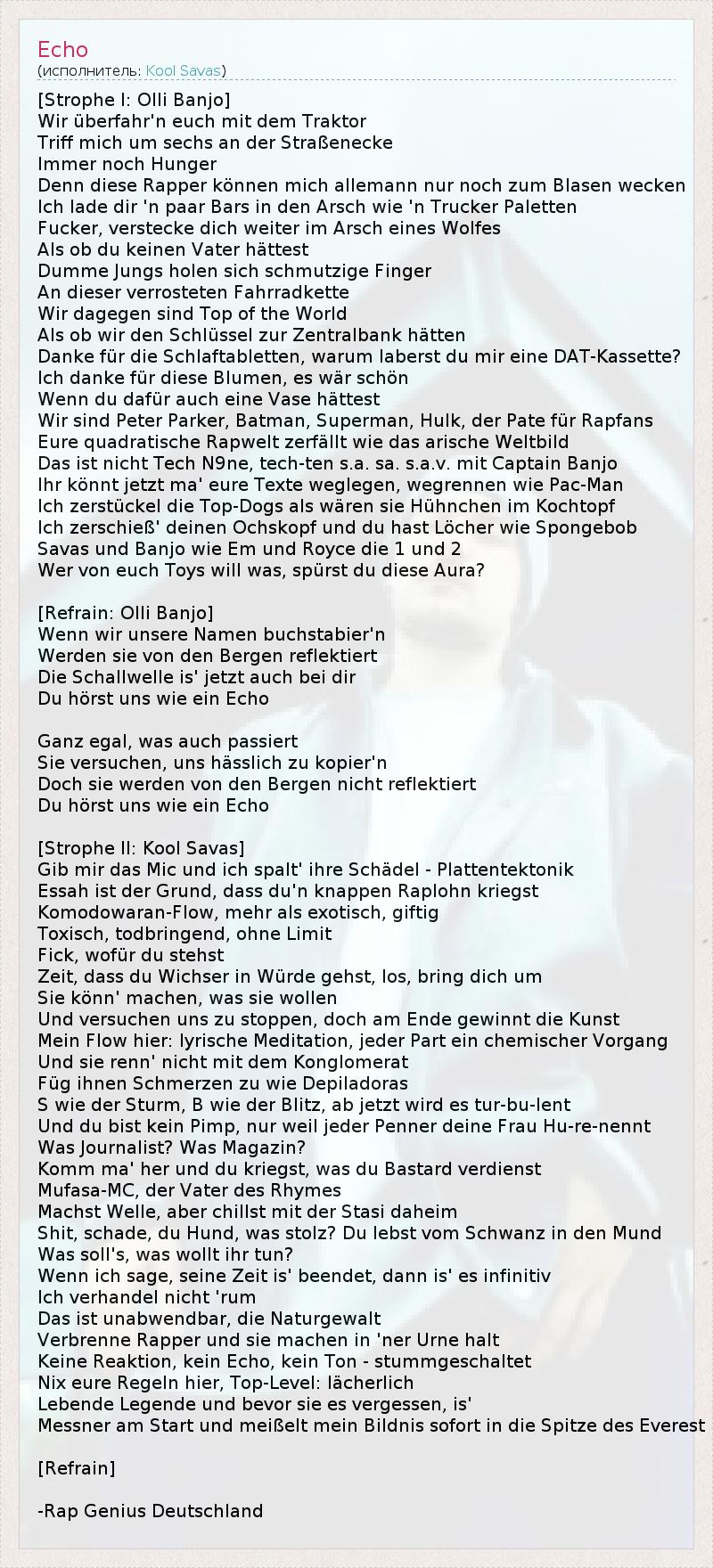 Это интересно:Kool Savas родился 10 февраля 1975 года в Аахене настоящее имя Savas Yurderi- это немецкий рэппер турецкого происхождения.Отец родом из Турции. в 1987 году они перебрались в Берлин.Карьера для этого рэппера началась с песни Warum rappst du? Дальше публика могла услышать его скандально известные песни: “Гомосексуальный рэппер”,“Соси мой *уй” и т.д. До этого момента его можно было услышать под псевдонимом... продолжение