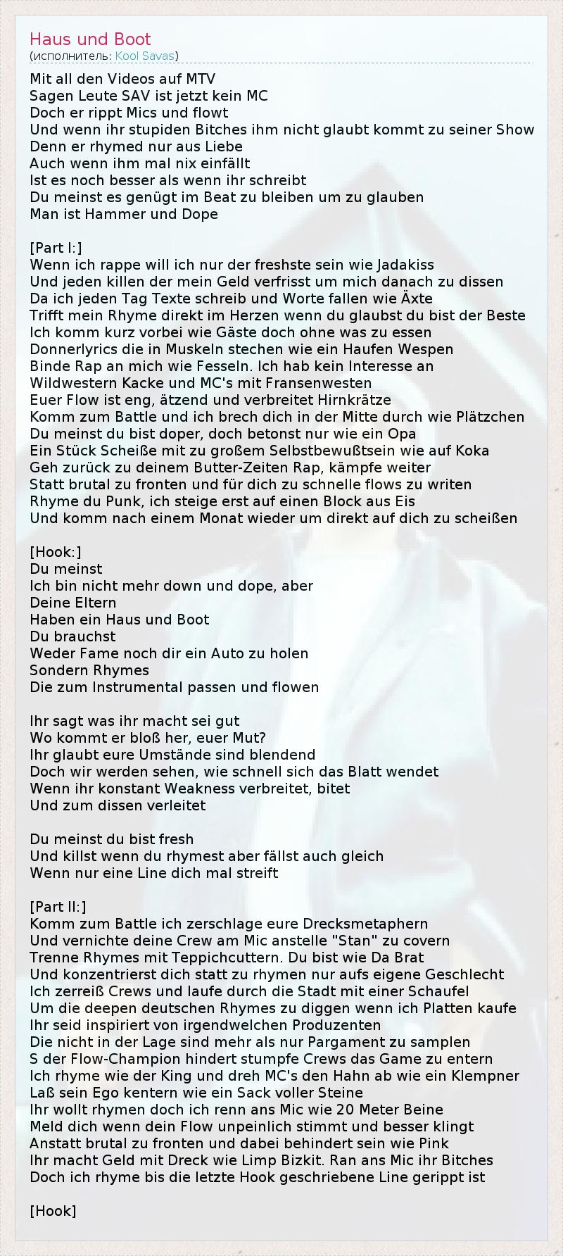 Mit all den Videos auf MTV Sagen Leute SAV ist jetzt kein MC Doch er rippt Mics und flowt Und wenn ihr stupiden Bitches ihm nicht glaubt kommt zu seiner Show Denn er rhymed nur aus Liebe Auch wenn ihm mal nix einfällt Ist es noch besser als wenn ihr schreibt Du meinst es genügt im Beat zu bleiben um zu glauben Man ist Hammer und Dope [Part I:] Wenn ich rappe will ich nur der freshste sein wie Jadakiss Und jeden killen der mein Geld verfrisst um mich danach zu dissen Da ich jeden Tag Texte schreib und Worte fallen wie Äxte Trifft mein Rhyme direkt im Herzen wenn du glaubst du bist der Beste Ich komm kurz vorbei wie Gäste doch ohne was zu essen Donnerlyrics die in Muskeln stechen wie ein Haufen Wespen Binde Rap an mich wie Fesseln. Ich hab kein Interesse an Wildwestern Kacke und MC's mit Fransenwesten Euer Flow ist eng, ätzend und verbreitet Hirnkrätze Komm zum Battle und ich brech dich in der Mitte durch wie Plätzchen Du meinst du bist doper, doch betonst nur wie ein Opa Ein Stück Scheiße mit zu großem Selbstbewußtsein wie auf Koka Geh zurück zu deinem Butter-Zeiten Rap, kämpfe weiter Statt brutal zu fronten und für dich zu schnelle flows zu writen Rhyme du Punk, ich steige erst auf einen Block aus Eis Und komm nach einem Monat wieder um direkt auf dich zu scheißen [Hook:] Du meinst Ich bin nicht mehr down und dope, aber Deine Eltern Haben ein Haus und Boot Du brauchst Weder Fame noch dir ein Auto zu holen Sondern Rhymes Die zum Instrumental passen und flowen Ihr sagt was ihr macht sei gut Wo kommt er bloß her, euer Mut? Ihr glaubt eure Umstände sind blendend Doch wir werden sehen, wie schnell sich das Blatt wendet Wenn ihr konstant Weakness verbreitet, bitet Und zum dissen verleitet Du meinst du bist fresh Und killst wenn du rhymest aber fällst auch gleich Wenn nur eine Line dich mal streift [Part II:] Komm zum Battle ich zerschlage eure Drecksmetaphern Und vernichte deine Crew am Mic anstelle "Stan" zu covern Trenne Rhymes mit Teppichcuttern. Du bist wie Da Brat Und konzentrierst dich statt zu rhymen nur aufs eigene Geschlecht Ich zerreiß Crews und laufe durch die Stadt mit einer Schaufel Um die deepen deutschen Rhymes zu diggen wenn ich Platten kaufe Ihr seid inspiriert von irgendwelchen Produzenten Die nicht in der Lage sind mehr als nur Pargament zu samplen S der Flow-Champion hindert stumpfe Crews das Game zu entern Ich rhyme wie der King und dreh MC's den Hahn ab wie ein Klempner Laß sein Ego kentern wie ein Sack voller Steine Ihr wollt rhymen doch ich renn ans Mic wie 20 Meter Beine Meld dich wenn dein Flow unpeinlich stimmt und besser klingt Anstatt brutal zu fronten und dabei behindert sein wie Pink Ihr macht Geld mit Dreck wie Limp Bizkit. Ran ans Mic ihr Bitches Doch ich rhyme bis die letzte Hook geschriebene Line gerippt ist [Hook]