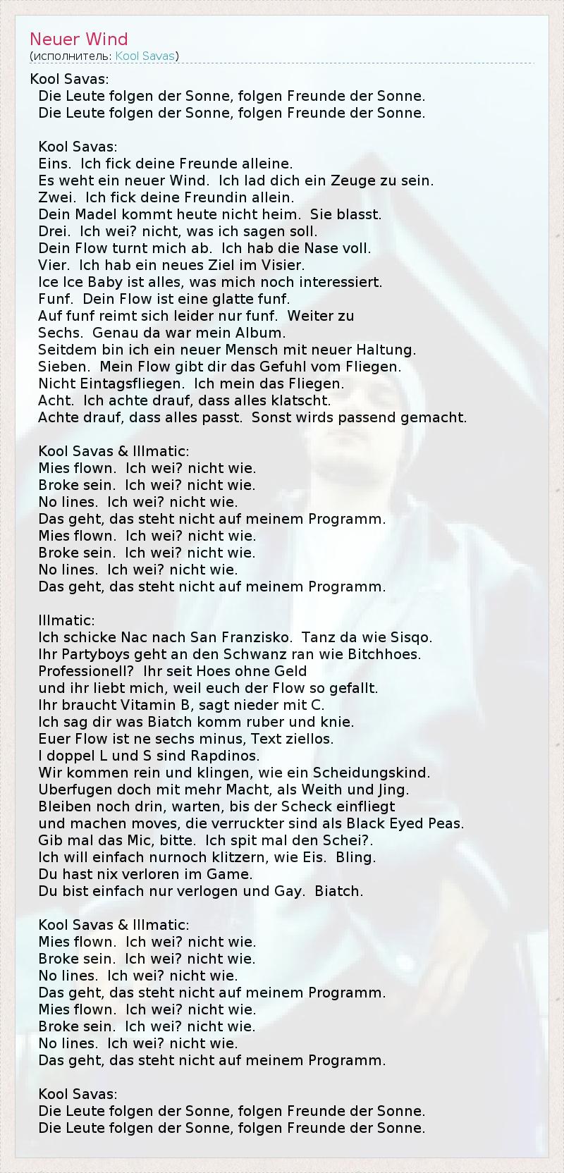 Это интересно:Kool Savas родился 10 февраля 1975 года в Аахене настоящее имя Savas Yurderi- это немецкий рэппер турецкого происхождения.Отец родом из Турции. в 1987 году они перебрались в Берлин.Карьера для этого рэппера началась с песни Warum rappst du? Дальше публика могла услышать его скандально известные песни: “Гомосексуальный рэппер”,“Соси мой *уй” и т.д. До этого момента его можно было услышать под псевдонимом... продолжение