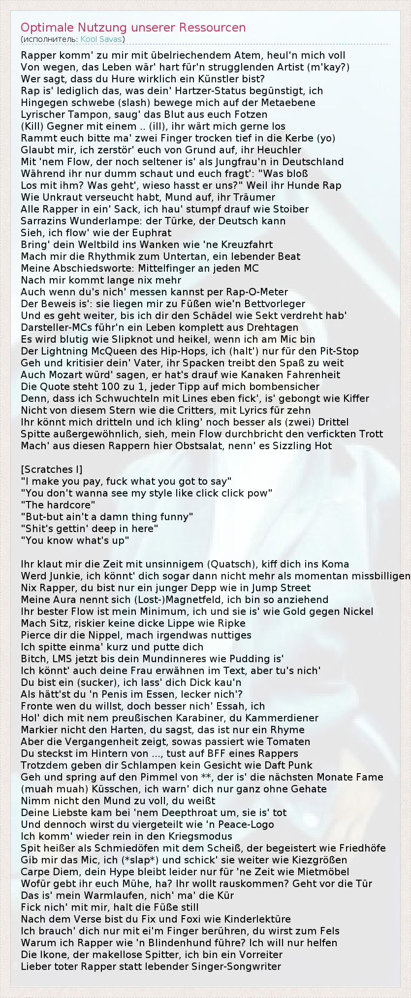 Rapper komm' zu mir mit übelriechendem Atem, heul'n mich voll Von wegen, das Leben wär' hart für'n strugglenden Artist (m'kay?) Wer sagt, dass du Hure wirklich ein Künstler bist? Rap is' lediglich das, was dein' Hartzer-Status begünstigt, ich Hingegen schwebe (slash) bewege mich auf der Metaebene Lyrischer Tampon, saug' das Blut aus euch Fotzen (Kill) Gegner mit einem .. (ill), ihr wärt mich gerne los Rammt euch bitte ma' zwei Finger trocken tief in die Kerbe (yo) Glaubt mir, ich zerstör' euch von Grund auf, ihr Heuchler Mit 'nem Flow, der noch seltener is' als Jungfrau'n in Deutschland Während ihr nur dumm schaut und euch fragt': "Was bloß Los mit ihm? Was geht', wieso hasst er uns?" Weil ihr Hunde Rap Wie Unkraut verseucht habt, Mund auf, ihr Träumer Alle Rapper in ein' Sack, ich hau' stumpf drauf wie Stoiber Sarrazins Wunderlampe: der Türke, der Deutsch kann Sieh, ich flow' wie der Euphrat Bring' dein Weltbild ins Wanken wie 'ne Kreuzfahrt Mach mir die Rhythmik zum Untertan, ein lebender Beat Meine Abschiedsworte: Mittelfinger an jeden MC Nach mir kommt lange nix mehr Auch wenn du's nich' messen kannst per Rap-O-Meter Der Beweis is': sie liegen mir zu Füßen wie'n Bettvorleger Und es geht weiter, bis ich dir den Schädel wie Sekt verdreht hab' Darsteller-MCs führ'n ein Leben komplett aus Drehtagen Es wird blutig wie Slipknot und heikel, wenn ich am Mic bin Der Lightning McQueen des Hip-Hops, ich (halt') nur für den Pit-Stop Geh und kritisier dein' Vater, ihr Spacken treibt den Spaß zu weit Auch Mozart würd' sagen, er hat's drauf wie Kanaken Fahrenheit Die Quote steht 100 zu 1, jeder Tipp auf mich bombensicher Denn, dass ich Schwuchteln mit Lines eben fick', is' gebongt wie Kiffer Nicht von diesem Stern wie die Critters, mit Lyrics für zehn Ihr könnt mich dritteln und ich kling' noch besser als (zwei) Drittel Spitte außergewöhnlich, sieh, mein Flow durchbricht den verfickten Trott Mach' aus diesen Rappern hier Obstsalat, nenn' es Sizzling Hot [Scratches I] "I make you pay, fuck what you got to say" "You don't wanna see my style like click click pow" "The hardcore" "But-but ain't a damn thing funny" "Shit's gettin' deep in here" "You know what's up" Ihr klaut mir die Zeit mit unsinnigem (Quatsch), kiff dich ins Koma Werd Junkie, ich könnt' dich sogar dann nicht mehr als momentan missbilligen Nix Rapper, du bist nur ein junger Depp wie in Jump Street Meine Aura nennt sich (Lost-)Magnetfeld, ich bin so anziehend Ihr bester Flow ist mein Minimum, ich und sie is' wie Gold gegen Nickel Mach Sitz, riskier keine dicke Lippe wie Ripke Pierce dir die Nippel, mach irgendwas nuttiges Ich spitte einma' kurz und putte dich Bitch, LMS jetzt bis dein Mundinneres wie Pudding is' Ich könnt' auch deine Frau erwähnen im Text, aber tu's nich' Du bist ein (sucker), ich lass' dich Dick kau'n Als hätt'st du 'n Penis im Essen, lecker nich'? Fronte wen du willst, doch besser nich' Essah, ich Hol' dich mit nem preußischen Karabiner, du Kammerdiener Markier nicht den Harten, du sagst, das ist nur ein Rhyme Aber die Vergangenheit zeigt, sowas passiert wie Tomaten Du steckst im Hintern von ..., tust auf BFF eines Rappers Trotzdem geben dir Schlampen kein Gesicht wie Daft Punk Geh und spring auf den Pimmel von **, der is' die nächsten Monate Fame (muah muah) Küsschen, ich warn' dich nur ganz ohne Gehate Nimm nicht den Mund zu voll, du weißt Deine Liebste kam bei 'nem Deepthroat um, sie is' tot Und dennoch wirst du viergeteilt wie 'n Peace-Logo Ich komm' wieder rein in den Kriegsmodus Spit heißer als Schmiedöfen mit dem Scheiß, der begeistert wie Friedhöfe Gib mir das Mic, ich (*slap*) und schick' sie weiter wie Kiezgrößen Carpe Diem, dein Hype bleibt leider nur für 'ne Zeit wie Mietmöbel Wofür gebt ihr euch Mühe, ha? Ihr wollt rauskommen? Geht vor die Tür Das is' mein Warmlaufen, nich' ma' die Kür Fick nich' mit mir, halt die Füße still Nach dem Verse bist du Fix und Foxi wie Kinderlektüre Ich brauch' dich nur mit ei'm Finger berühren, du wirst zum Fels Warum ich Rapper wie 'n Blindenhund führe? Ich will nur helfen Die Ikone, der makellose Spitter, ich bin ein Vorreiter Lieber toter Rapper statt lebender Singer-Songwriter