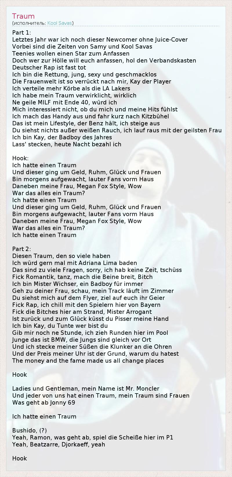Part 1: Letztes Jahr war ich noch dieser Newcomer ohne Juice-Cover Vorbei sind die Zeiten von Samy und Kool Savas Teenies wollen einen Star zum Anfassen Doch wer zur Hölle will euch anfassen, hol den Verbandskasten Deutscher Rap ist fast tot Ich bin die Rettung, jung, sexy und geschmacklos Die Frauenwelt ist so verrückt nach mir, Kay der Player Ich verteile mehr Körbe als die LA Lakers Ich habe mein Traum verwirklicht, wirklich Ne geile MILF mit Ende 40, würd ich Mich interessiert nicht, ob du mich und meine Hits fühlst Ich mach das Handy aus und fahr kurz nach Kitzbühel Das ist mein Lifestyle, der Benz hält, ich steige aus Du siehst nichts außer weißen Rauch, ich lauf raus mit der geilsten Frau Ich bin Kay, der Badboy des Jahres Lass' stecken, heute Nacht bezahl ich Hook: Ich hatte einen Traum Und dieser ging um Geld, Ruhm, Glück und Frauen Bin morgens aufgewacht, lauter Fans vorm Haus Daneben meine Frau, Megan Fox Style, Wow War das alles ein Traum? Ich hatte einen Traum Und dieser ging um Geld, Ruhm, Glück und Frauen Bin morgens aufgewacht, lauter Fans vorm Haus Daneben meine Frau, Megan Fox Style, Wow War das alles ein Traum? Ich hatte einen Traum Part 2: Diesen Traum, den so viele haben Ich würd gern mal mit Adriana Lima baden Das sind zu viele Fragen, sorry, ich hab keine Zeit, tschüss Fick Romantik, tanz, mach die Beine breit, Bitch Ich bin Mister Wichser, ein Badboy für immer Geh zu deiner Frau, schau, mein Track läuft im Zimmer Du siehst mich auf dem Flyer, ziel auf euch ihr Geier Fick Rap, ich chill mit den Spielern hier von Bayern Fick die Bitches hier am Strand, Mister Arrogant Ist zurück und zum Glück küsst du Pisser meine Hand Ich bin Kay, du Tunte wer bist du Gib mir noch ne Stunde, ich zieh Runden hier im Pool Junge das ist BMW, die Jungs sind gleich vor Ort Und ich stecke meiner Süßen die Klunker an die Ohren Und der Preis meiner Uhr ist der Grund, warum du hatest The money and the fame made us all change places Hook Ladies und Gentleman, mein Name ist Mr. Moncler Und jeder von uns hat einen Traum, mein Traum sind Frauen Was geht ab Jonny 69 Ich hatte einen Traum Bushido, (?) Yeah, Ramon, was geht ab, spiel die Scheiße hier im P1 Yeah, Beatzarre, Djorkaeff, yeah Hook