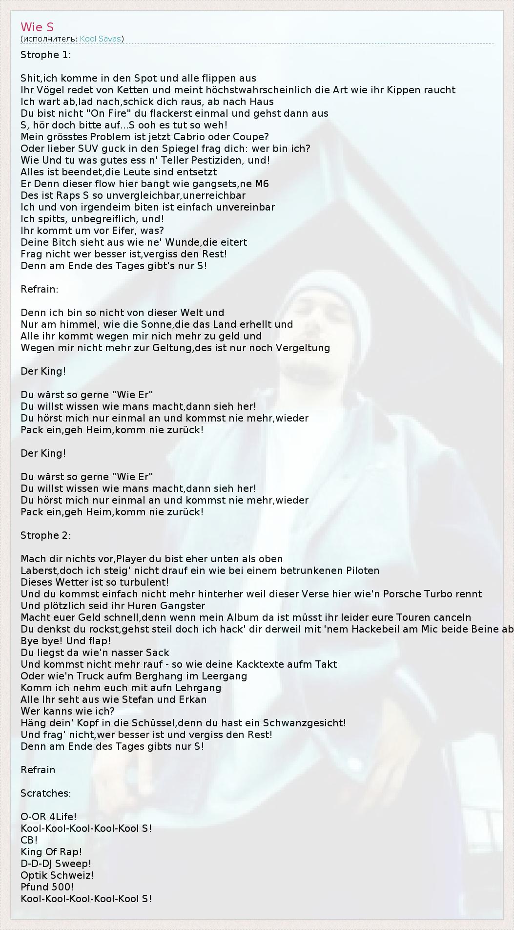 Strophe 1: Shit,ich komme in den Spot und alle flippen aus Ihr Vögel redet von Ketten und meint höchstwahrscheinlich die Art wie ihr Kippen raucht Ich wart ab,lad nach,schick dich raus, ab nach Haus Du bist nicht "On Fire" du flackerst einmal und gehst dann aus S, hör doch bitte auf...S ooh es tut so weh! Mein grösstes Problem ist jetzt Cabrio oder Coupe? Oder lieber SUV guck in den Spiegel frag dich: wer bin ich? Wie Und tu was gutes ess n' Teller Pestiziden, und! Alles ist beendet,die Leute sind entsetzt Er Denn dieser flow hier bangt wie gangsets,ne M6 Des ist Raps S so unvergleichbar,unerreichbar Ich und von irgendeim biten ist einfach unvereinbar Ich spitts, unbegreiflich, und! Ihr kommt um vor Eifer, was? Deine Bitch sieht aus wie ne' Wunde,die eitert Frag nicht wer besser ist,vergiss den Rest! Denn am Ende des Tages gibt's nur S! Refrain: Denn ich bin so nicht von dieser Welt und Nur am himmel, wie die Sonne,die das Land erhellt und Alle ihr kommt wegen mir nich mehr zu geld und Wegen mir nicht mehr zur Geltung,des ist nur noch Vergeltung Der King! Du wärst so gerne "Wie Er" Du willst wissen wie mans macht,dann sieh her! Du hörst mich nur einmal an und kommst nie mehr,wieder Pack ein,geh Heim,komm nie zurück! Der King! Du wärst so gerne "Wie Er" Du willst wissen wie mans macht,dann sieh her! Du hörst mich nur einmal an und kommst nie mehr,wieder Pack ein,geh Heim,komm nie zurück! Strophe 2: Mach dir nichts vor,Player du bist eher unten als oben Laberst,doch ich steig' nicht drauf ein wie bei einem betrunkenen Piloten Dieses Wetter ist so turbulent! Und du kommst einfach nicht mehr hinterher weil dieser Verse hier wie'n Porsche Turbo rennt Und plötzlich seid ihr Huren Gangster Macht euer Geld schnell,denn wenn mein Album da ist müsst ihr leider eure Touren canceln Du denkst du rockst,gehst steil doch ich hack' dir derweil mit 'nem Hackebeil am Mic beide Beine ab Bye bye! Und flap! Du liegst da wie'n nasser Sack Und kommst nicht mehr rauf - so wie deine Kacktexte aufm Takt Oder wie'n Truck aufm Berghang im Leergang Komm ich nehm euch mit aufn Lehrgang Alle Ihr seht aus wie Stefan und Erkan Wer kanns wie ich? Häng dein' Kopf in die Schüssel,denn du hast ein Schwanzgesicht! Und frag' nicht,wer besser ist und vergiss den Rest! Denn am Ende des Tages gibts nur S! Refrain Scratches: O-OR 4Life! Kool-Kool-Kool-Kool-Kool S! CB! King Of Rap! D-D-DJ Sweep! Optik Schweiz! Pfund 500! Kool-Kool-Kool-Kool-Kool S!