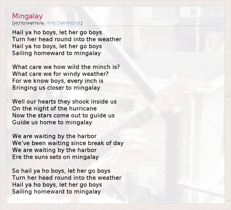 Hail ya ho boys, let her go boys Turn her head round into the weather Hail ya ho boys, let her go boys Sailing homeward to mingalay What care we how wild the minch is? What care we for windy weather? For we know boys, every inch is Bringing us closer to mingalay Well our hearts they shook inside us On the night of the hurricane Now the stars come out to guide us Guide us home to mingalay We are waiting by the harbor We've been waiting since break of day We are waiting by the harbor Ere the suns sets on mingalay So hail ya ho boys, let her go boys Turn her head round into the weather Hail ya ho boys, let her go boys Sailing homeward to mingalay