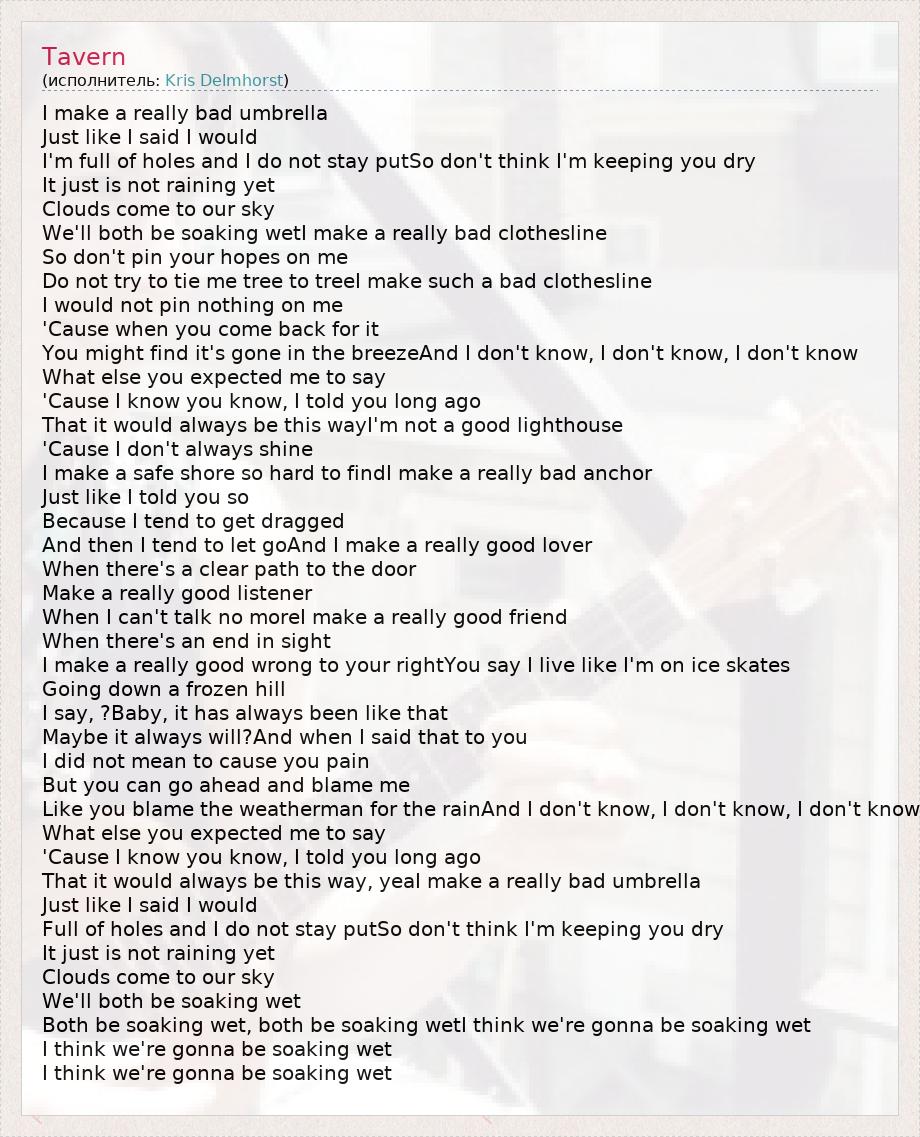 I make a really bad umbrella Just like I said I would I'm full of holes and I do not stay putSo don't think I'm keeping you dry It just is not raining yet Clouds come to our sky We'll both be soaking wetI make a really bad clothesline So don't pin your hopes on me Do not try to tie me tree to treeI make such a bad clothesline I would not pin nothing on me 'Cause when you come back for it You might find it's gone in the breezeAnd I don't know, I don't know, I don't know What else you expected me to say 'Cause I know you know, I told you long ago That it would always be this wayI'm not a good lighthouse 'Cause I don't always shine I make a safe shore so hard to findI make a really bad anchor Just like I told you so Because I tend to get dragged And then I tend to let goAnd I make a really good lover When there's a clear path to the door Make a really good listener When I can't talk no moreI make a really good friend When there's an end in sight I make a really good wrong to your rightYou say I live like I'm on ice skates Going down a frozen hill I say, ?Baby, it has always been like that Maybe it always will?And when I said that to you I did not mean to cause you pain But you can go ahead and blame me Like you blame the weatherman for the rainAnd I don't know, I don't know, I don't know What else you expected me to say 'Cause I know you know, I told you long ago That it would always be this way, yeaI make a really bad umbrella Just like I said I would Full of holes and I do not stay putSo don't think I'm keeping you dry It just is not raining yet Clouds come to our sky We'll both be soaking wet Both be soaking wet, both be soaking wetI think we're gonna be soaking wet I think we're gonna be soaking wet I think we're gonna be soaking wet
