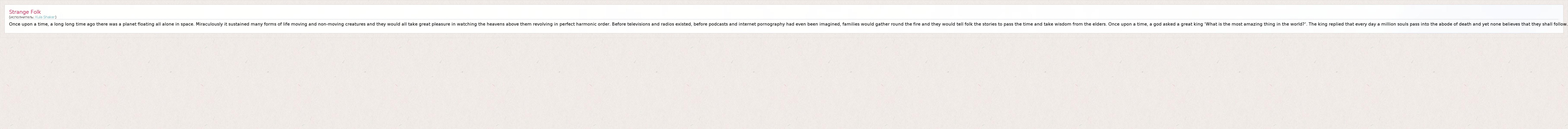 Once upon a time, a long long time ago there was a planet floating all alone in space. Miraculously it sustained many forms of life moving and non-moving creatures and they would all take great pleasure in watching the heavens above them revolving in perfect harmonic order. Before televisions and radios existed, before podcasts and internet pornography had even been imagined, families would gather round the fire and they would tell folk the stories to pass the time and take wisdom from the elders. Once upon a time, a god asked a great king 'What is the most amazing thing in the world?'. The king replied that every day a million souls pass into the abode of death and yet none believes that they shall follow.