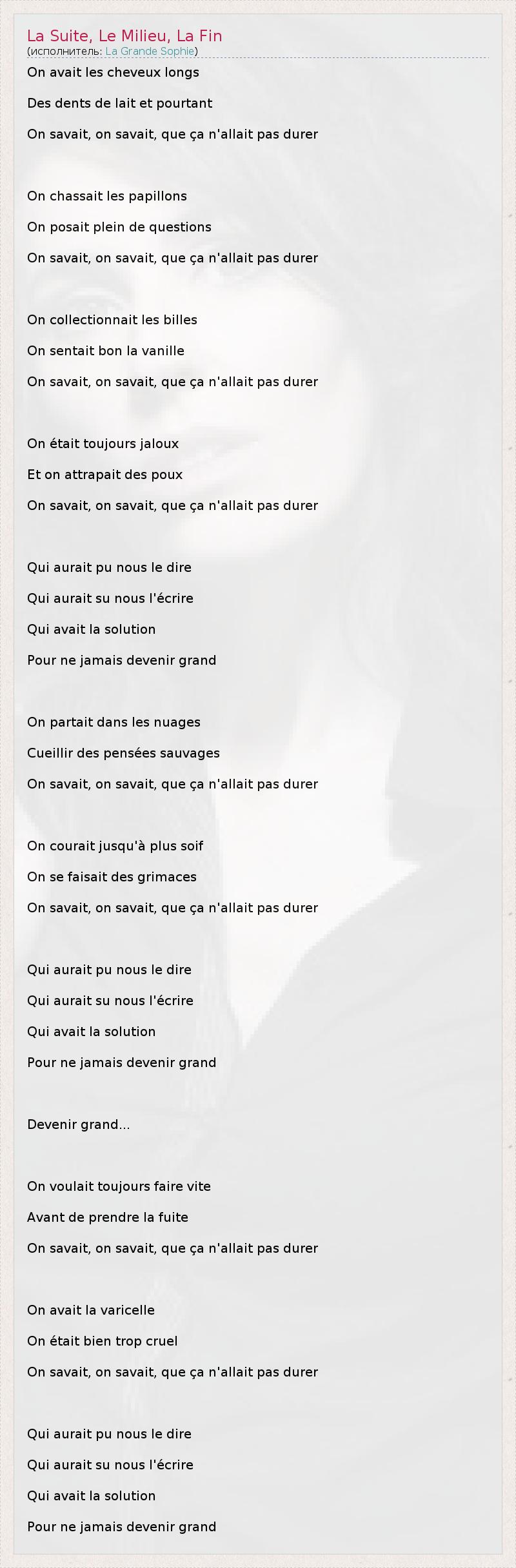 On avait les cheveux longs Des dents de lait et pourtant On savait, on savait, que ça n'allait pas durer On chassait les papillons On posait plein de questions On savait, on savait, que ça n'allait pas durer On collectionnait les billes On sentait bon la vanille On savait, on savait, que ça n'allait pas durer On était toujours jaloux Et on attrapait des poux On savait, on savait, que ça n'allait pas durer Qui aurait pu nous le dire Qui aurait su nous l'écrire Qui avait la solution Pour ne jamais devenir grand On partait dans les nuages Cueillir des pensées sauvages On savait, on savait, que ça n'allait pas durer On courait jusqu'à plus soif On se faisait des grimaces On savait, on savait, que ça n'allait pas durer Qui aurait pu nous le dire Qui aurait su nous l'écrire Qui avait la solution Pour ne jamais devenir grand Devenir grand... On voulait toujours faire vite Avant de prendre la fuite On savait, on savait, que ça n'allait pas durer On avait la varicelle On était bien trop cruel On savait, on savait, que ça n'allait pas durer Qui aurait pu nous le dire Qui aurait su nous l'écrire Qui avait la solution Pour ne jamais devenir grand
