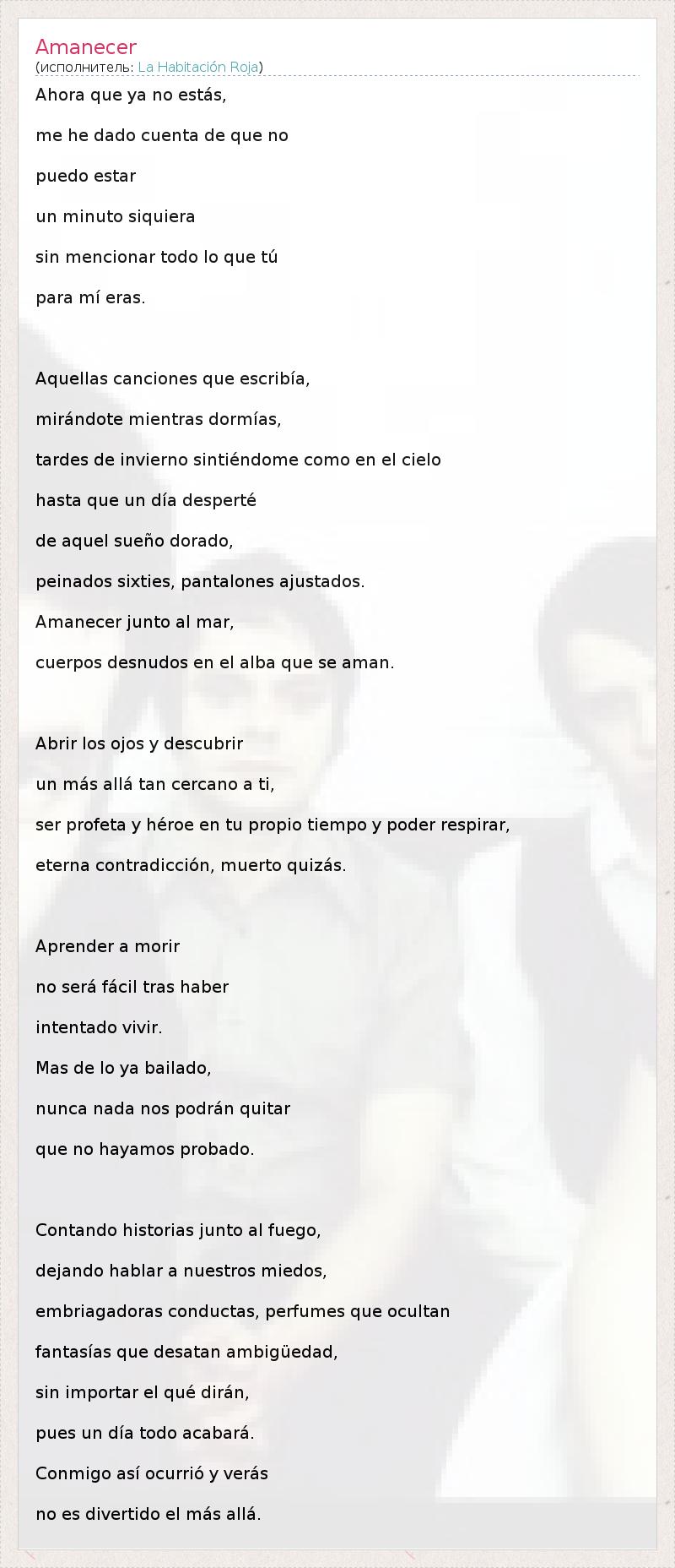 Ahora que ya no estás, me he dado cuenta de que no puedo estar un minuto siquiera sin mencionar todo lo que tú para mí eras. Aquellas canciones que escribía, mirándote mientras dormías, tardes de invierno sintiéndome como en el cielo hasta que un día desperté de aquel sueño dorado, peinados sixties, pantalones ajustados. Amanecer junto al mar, cuerpos desnudos en el alba que se aman. Abrir los ojos y descubrir un más allá tan cercano a ti, ser profeta y héroe en tu propio tiempo y poder respirar, eterna contradicción, muerto quizás. Aprender a morir no será fácil tras haber intentado vivir. Mas de lo ya bailado, nunca nada nos podrán quitar que no hayamos probado. Contando historias junto al fuego, dejando hablar a nuestros miedos, embriagadoras conductas, perfumes que ocultan fantasías que desatan ambigüedad, sin importar el qué dirán, pues un día todo acabará. Conmigo así ocurrió y verás no es divertido el más allá.