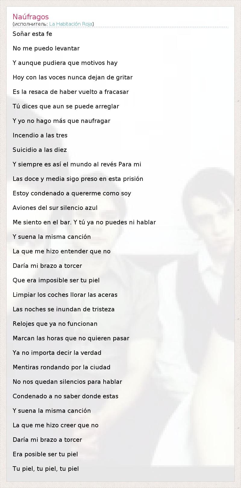Soñar esta fe No me puedo levantar Y aunque pudiera que motivos hay Hoy con las voces nunca dejan de gritar Es la resaca de haber vuelto a fracasar Tú dices que aun se puede arreglar Y yo no hago más que naufragar Incendio a las tres Suicidio a las diez Y siempre es así el mundo al revés Para mi Las doce y media sigo preso en esta prisión Estoy condenado a quererme como soy Aviones del sur silencio azul Me siento en el bar. Y tú ya no puedes ni hablar Y suena la misma canción La que me hizo entender que no Daría mi brazo a torcer Que era imposible ser tu piel Limpiar los coches llorar las aceras Las noches se inundan de tristeza Relojes que ya no funcionan Marcan las horas que no quieren pasar Ya no importa decir la verdad Mentiras rondando por la ciudad No nos quedan silencios para hablar Condenado a no saber donde estas Y suena la misma canción La que me hizo creer que no Daría mi brazo a torcer Era posible ser tu piel Tu piel, tu piel, tu piel