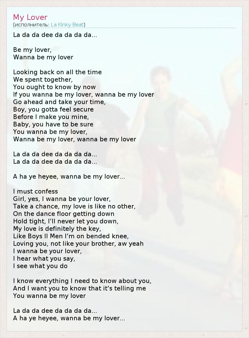 La da da dee da da da da... Be my lover, Wanna be my lover Looking back on all the time We spent together, You ought to know by now If you wanna be my lover, wanna be my lover Go ahead and take your time, Boy, you gotta feel secure Before I make you mine, Baby, you have to be sure You wanna be my lover, Wanna be my lover, wanna be my lover La da da dee da da da da... La da da dee da da da da... A ha ye heyee, wanna be my lover... I must confess Girl, yes, I wanna be your lover, Take a chance, my love is like no other, On the dance floor getting down Hold tight, I'll never let you down, My love is definitely the key, Like Boys II Men I'm on bended knee, Loving you, not like your brother, aw yeah I wanna be your lover, I hear what you say, I see what you do I know everything I need to know about you, And I want you to know that it's telling me You wanna be my lover La da da dee da da da da... A ha ye heyee, wanna be my lover...