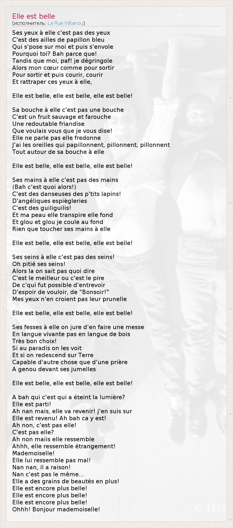 Ses yeux à elle c'est pas des yeux C'est des ailles de papillon bleu Qui s'pose sur moi et puis s'envole Pourquoi toi? Bah parce que! Tandis que moi, paf! je dégringole Alors mon cœur comme pour sortir Pour sortir et puis courir, courir Et rattraper ces yeux à elle, Elle est belle, elle est belle, elle est belle! Sa bouche à elle c'est pas une bouche C'est un fruit sauvage et farouche Une redoutable friandise Que voulais vous que je vous dise! Elle ne parle pas elle fredonne J'ai les oreilles qui papillonnent, pillonnent, pillonnent Tout autour de sa bouche à elle Elle est belle, elle est belle, elle est belle! Ses mains à elle c'est pas des mains (Bah c'est quoi alors!) C'est des danseuses des p'tits lapins! D'angéliques espiègleries C'est des guiliguilis! Et ma peau elle transpire elle fond Et glou et glou je coule au fond Rien que toucher ses mains à elle Elle est belle, elle est belle, elle est belle! Ses seins à elle c'est pas des seins! Oh pitié ses seins! Alors la on sait pas quoi dire C'est le meilleur ou c'est le pire De c'qui fut possible d'entrevoir D'espoir de vouloir, de "Bonsoir!" Mes yeux n'en croient pas leur prunelle Elle est belle, elle est belle, elle est belle! Ses fesses à elle on jure d'en faire une messe En langue vivante pas en langue de bois Très bon choix! Si au paradis on les voit Et si on redescend sur Terre Capable d'autre chose que d'une prière A genou devant ses jumelles Elle est belle, elle est belle, elle est belle! A bah qui c'est qui a éteint la lumière? Elle est parti! Ah nan mais, elle va revenir! j'en suis sur Elle est revenu! Ah bah ca y est! Ah non, c'est pas elle! C'est pas elle? Ah non maiis elle ressemble Ahhh, elle ressemble étrangement! Mademoiselle! Elle lui ressemble pas mal! Nan nan, il a raison! Nan c'est pas le même... Elle a des grains de beautés en plus! Elle est encore plus belle! Elle est encore plus belle! Elle est encore plus belle! Ohhh! Bonjour mademoiselle!