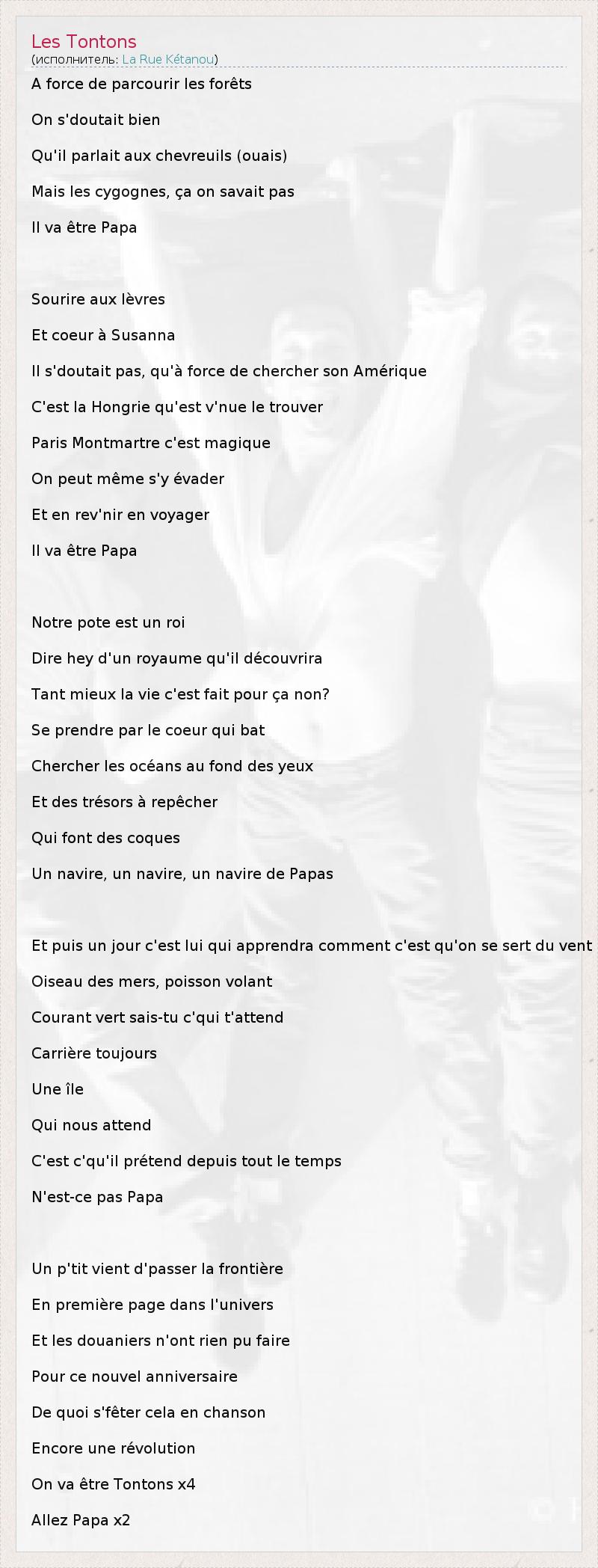 A force de parcourir les forêts On s'doutait bien Qu'il parlait aux chevreuils (ouais) Mais les cygognes, ça on savait pas Il va être Papa Sourire aux lèvres Et coeur à Susanna Il s'doutait pas, qu'à force de chercher son Amérique C'est la Hongrie qu'est v'nue le trouver Paris Montmartre c'est magique On peut même s'y évader Et en rev'nir en voyager Il va être Papa Notre pote est un roi Dire hey d'un royaume qu'il découvrira Tant mieux la vie c'est fait pour ça non? Se prendre par le coeur qui bat Chercher les océans au fond des yeux Et des trésors à repêcher Qui font des coques Un navire, un navire, un navire de Papas Et puis un jour c'est lui qui apprendra comment c'est qu'on se sert du vent Oiseau des mers, poisson volant Courant vert sais-tu c'qui t'attend Carrière toujours Une île Qui nous attend C'est c'qu'il prétend depuis tout le temps N'est-ce pas Papa Un p'tit vient d'passer la frontière En première page dans l'univers Et les douaniers n'ont rien pu faire Pour ce nouvel anniversaire De quoi s'fêter cela en chanson Encore une révolution On va être Tontons x4 Allez Papa x2