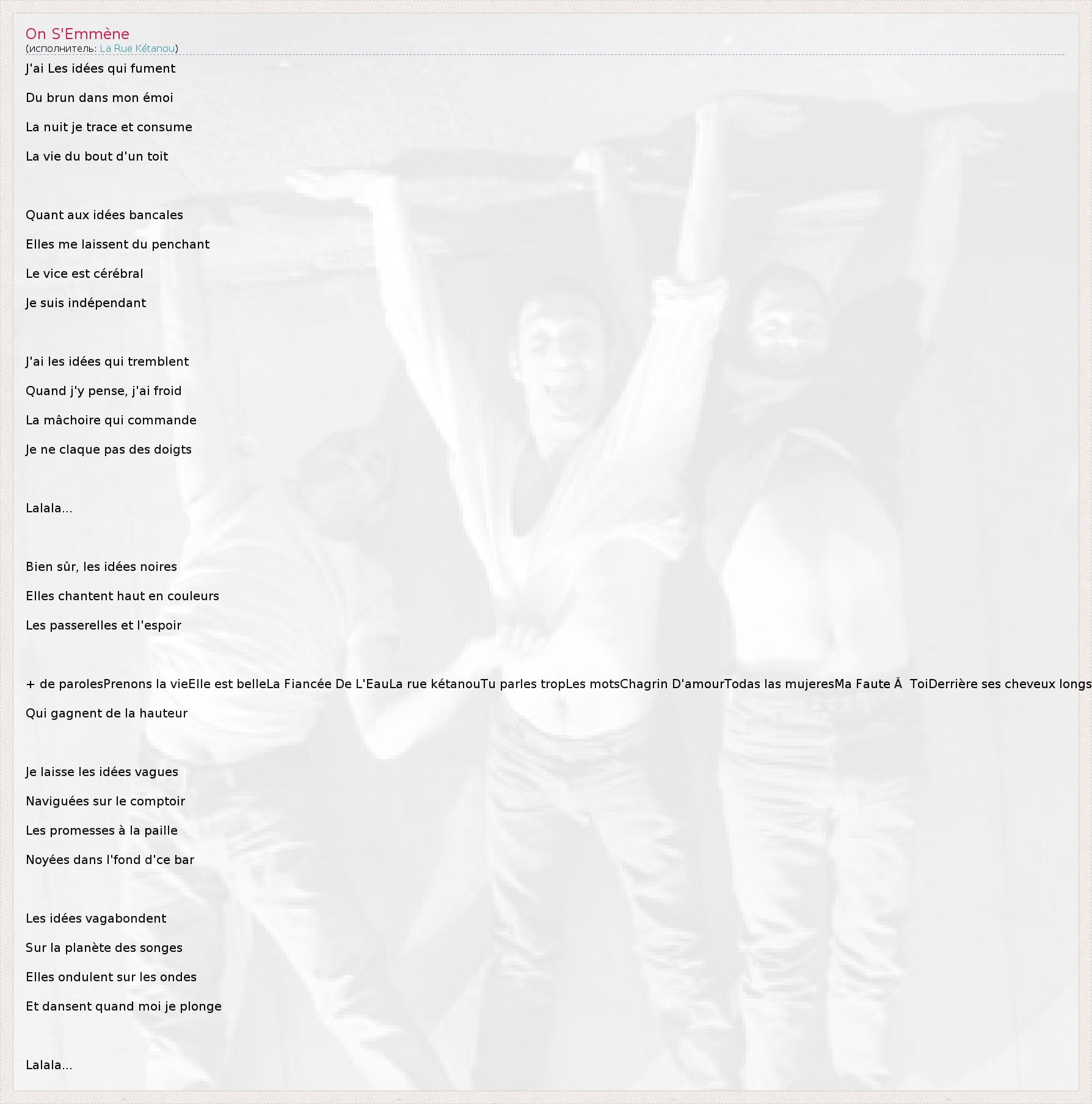 J'ai Les idées qui fument Du brun dans mon émoi La nuit je trace et consume La vie du bout d'un toit Quant aux idées bancales Elles me laissent du penchant Le vice est cérébral Je suis indépendant J'ai les idées qui tremblent Quand j'y pense, j'ai froid La mâchoire qui commande Je ne claque pas des doigts Lalala... Bien sûr, les idées noires Elles chantent haut en couleurs Les passerelles et l'espoir + de parolesPrenons la vieElle est belleLa Fiancée De L'EauLa rue kétanouTu parles tropLes motsChagrin D'amourTodas las mujeresMa Faute à ToiDerrière ses cheveux longs Qui gagnent de la hauteur Je laisse les idées vagues Naviguées sur le comptoir Les promesses à la paille Noyées dans l'fond d'ce bar Les idées vagabondent Sur la planète des songes Elles ondulent sur les ondes Et dansent quand moi je plonge Lalala...