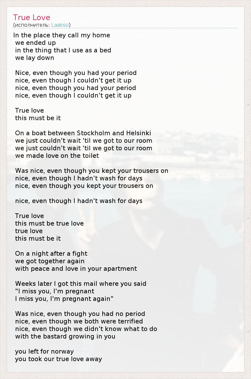 In the place they call my home we ended up in the thing that I use as a bed we lay down Nice, even though you had your period nice, even though I couldn't get it up nice, even though you had your period nice, even though I couldn't get it up True love this must be it On a boat between Stockholm and Helsinki we just couldn't wait 'til we got to our room we just couldn't wait 'til we got to our room we made love on the toilet Was nice, even though you kept your trousers on nice, even though I hadn't wash for days nice, even though you kept your trousers on nice, even though I hadn't wash for days True love this must be true love true love this must be it On a night after a fight we got together again with peace and love in your apartment Weeks later I got this mail where you said "I miss you, I'm pregnant I miss you, I'm pregnant again" Was nice, even though you had no period nice, even though we both were terrified nice, even though we didn't know what to do with the bastard growing in you you left for norway you took our true love away