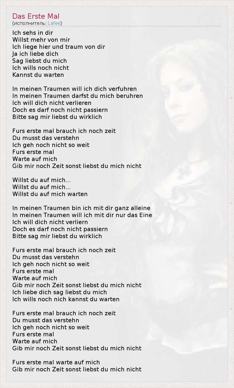 Ich sehs in dir Willst mehr von mir Ich liege hier und traum von dir Ja ich liebe dich Sag liebst du mich Ich wills noch nicht Kannst du warten In meinen Traumen will ich dich verfuhren In meinen Traumen darfst du mich beruhren Ich will dich nicht verlieren Doch es darf noch nicht passiern Bitte sag mir liebst du wirklich Furs erste mal brauch ich noch zeit Du musst das verstehn Ich geh noch nicht so weit Furs erste mal Warte auf mich Gib mir noch Zeit sonst liebst du mich nicht Willst du auf mich... Willst du auf mich... Willst du auf mich warten In meinen Traumen bin ich mit dir ganz alleine In meinen Traumen will ich mit dir nur das Eine Ich will dich nicht verliern Doch es darf noch nicht passiern Bitte sag mir liebst du wirklich Furs erste mal brauch ich noch zeit Du musst das verstehn Ich geh noch nicht so weit Furs erste mal Warte auf mich Gib mir noch Zeit sonst liebst du mich nicht Ich liebe dich sag liebst du mich Ich wills noch nich kannst du warten Furs erste mal brauch ich noch zeit Du musst das verstehn Ich geh noch nicht so weit Furs erste mal Warte auf mich Gib mir noch Zeit sonst liebst du mich nicht Furs erste mal warte auf mich Gib mir noch Zeit sonst liebst du mich nicht